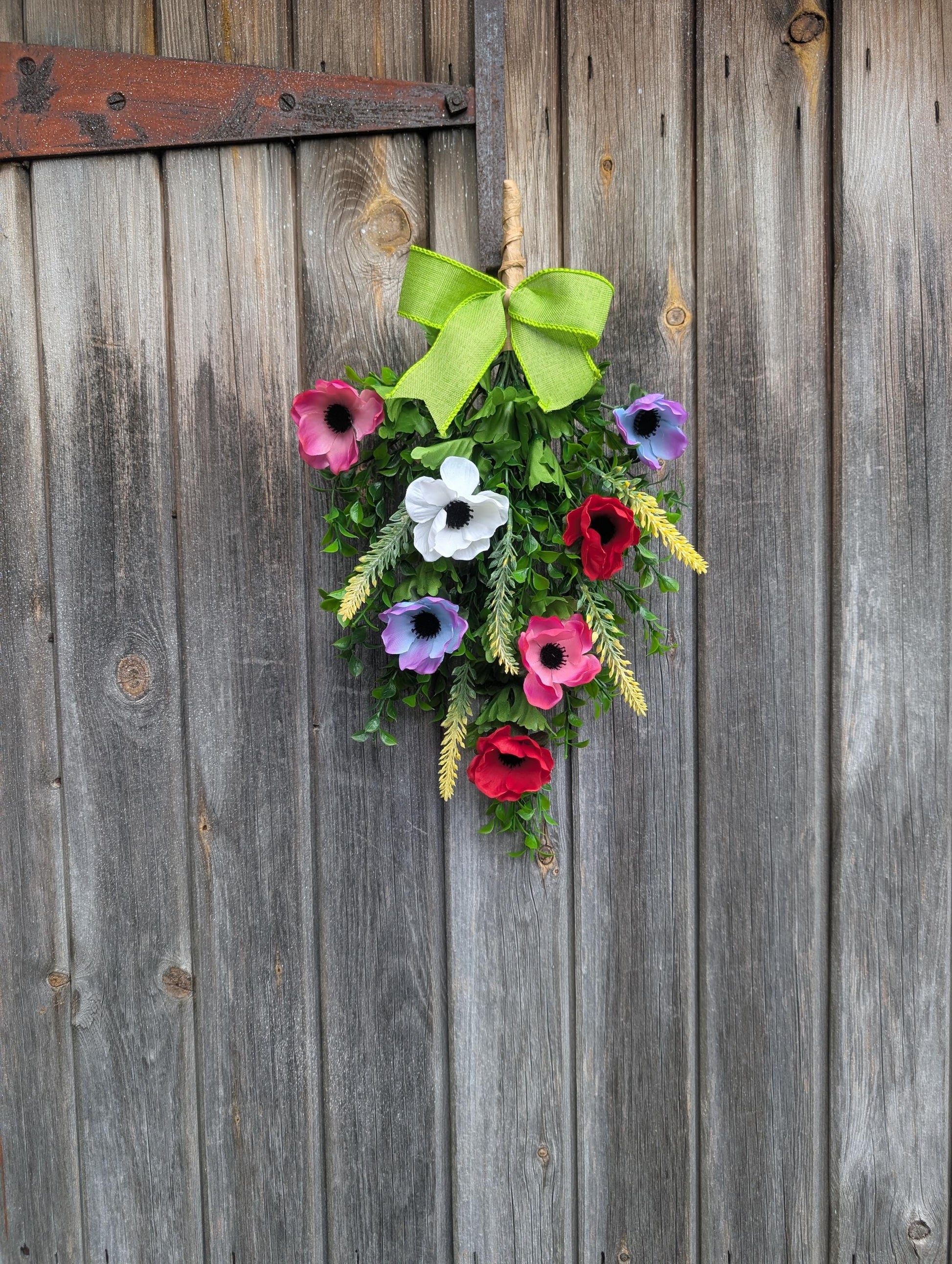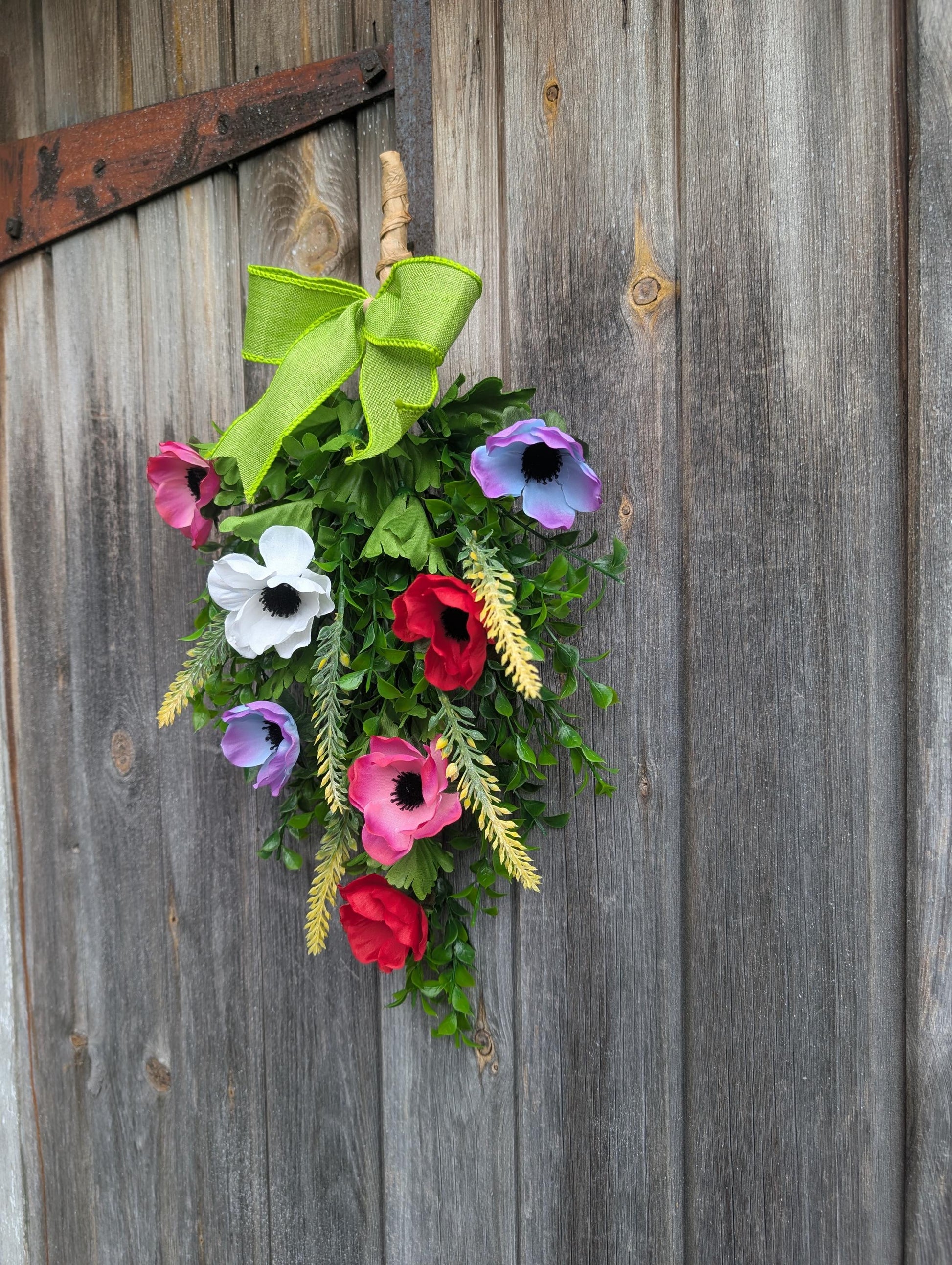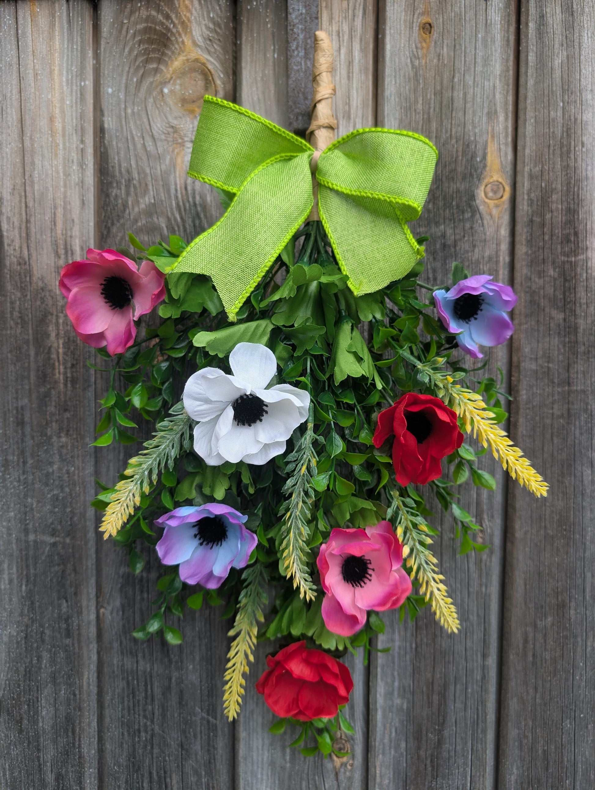 Enhance your home decor with this Anemone Swag that adds a touch of Farmhouse Kitchen style. Use it as Wall Art, hang it on your Front Door, or give it as a housewarming gift. The Spring Swag is made with a variety of Faux Anemone on a plastic tea leaf base with yellow heather detail. The handle is secured with Raffia and features a choice of Green jute , hessian with Butterfly detail or white bee pattern bow. Measuring approximately 16 inches (40 cm) long and 11 inches (28 cm) wide at its largest point, this swag is a versatile and charming addition to any space.
