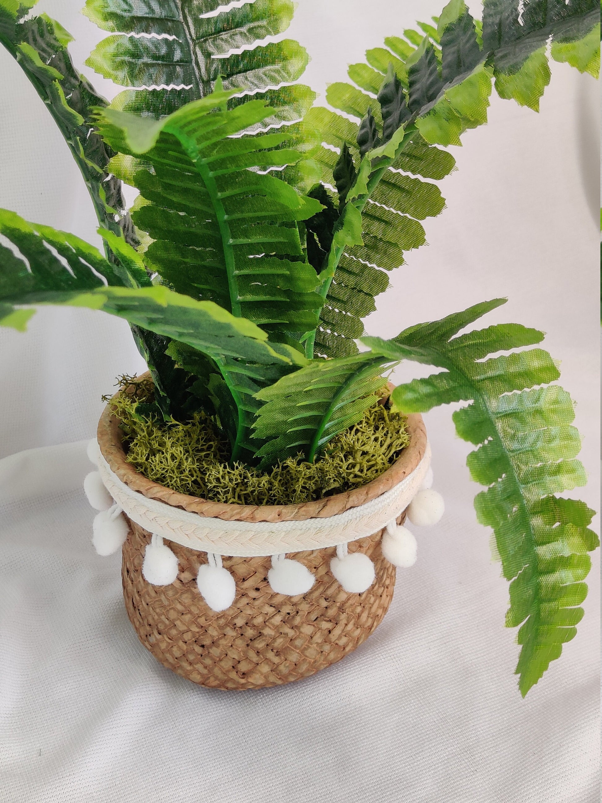 Add a touch of contemporary style to your home or patio with these Artificial Boston Ferns. Each plant comes in a Ceramic Belly Pot Planter, featuring Pompom details along the top edge. Perfect as a housewarming gift or for adding some greenery to any room.