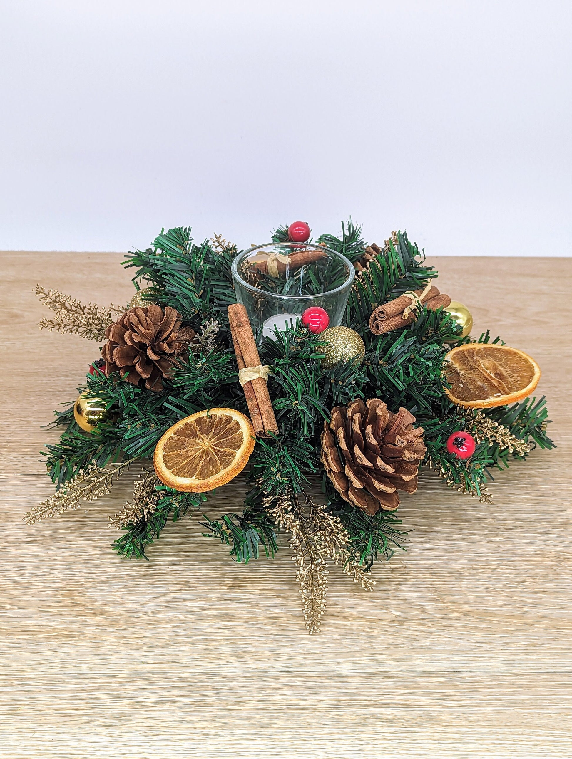 This Country Cottage Christmas Table Centrepiece is the perfect addition to any holiday table setting. It can also be displayed on a hallway sideboard, coffee table, or windowsill to add a festive touch to any room. The arrangement features real cinnamon sticks, dried orange slices, pine cones, gold baubles, gold heather, and red berry accents, all placed on an artificial Christmas tree base. At the center of the arrangement is a votive candle holder with a tea light candle. Measuring approximately 28cm in diameter and 12cm tall, this table decoration is sure to bring Christmas cheer to any home. Please note that the shape of the votive holder may vary, but it will always be made of clear glass.