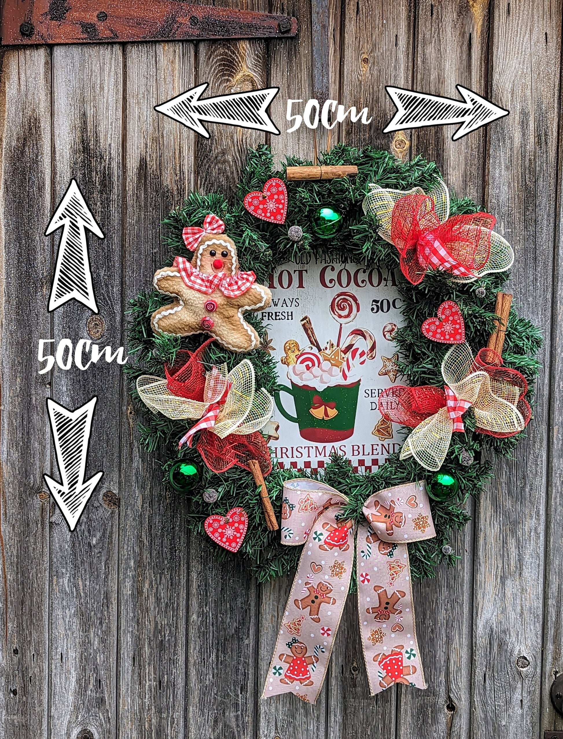 This Gingerbread Hot Chocolate Christmas Wreath is the perfect addition for any home. Whether used as an indoor decoration or outdoor Gingerbread Man Door Decoration, the Artificial Wreath measures approximately 50cm in diameter, not including the bow tales. This festive wreath showcases a tin sign featuring Hot Chocolate in the center, alongside a gingerbread person, Cinnamon sticks, Green baubles, red wooden hearts, frosted berries, and deco mesh and gingham ribbon puffs. It is beautifully finished off with a gingerbread design bow and placed on a faux Christmas tree base.