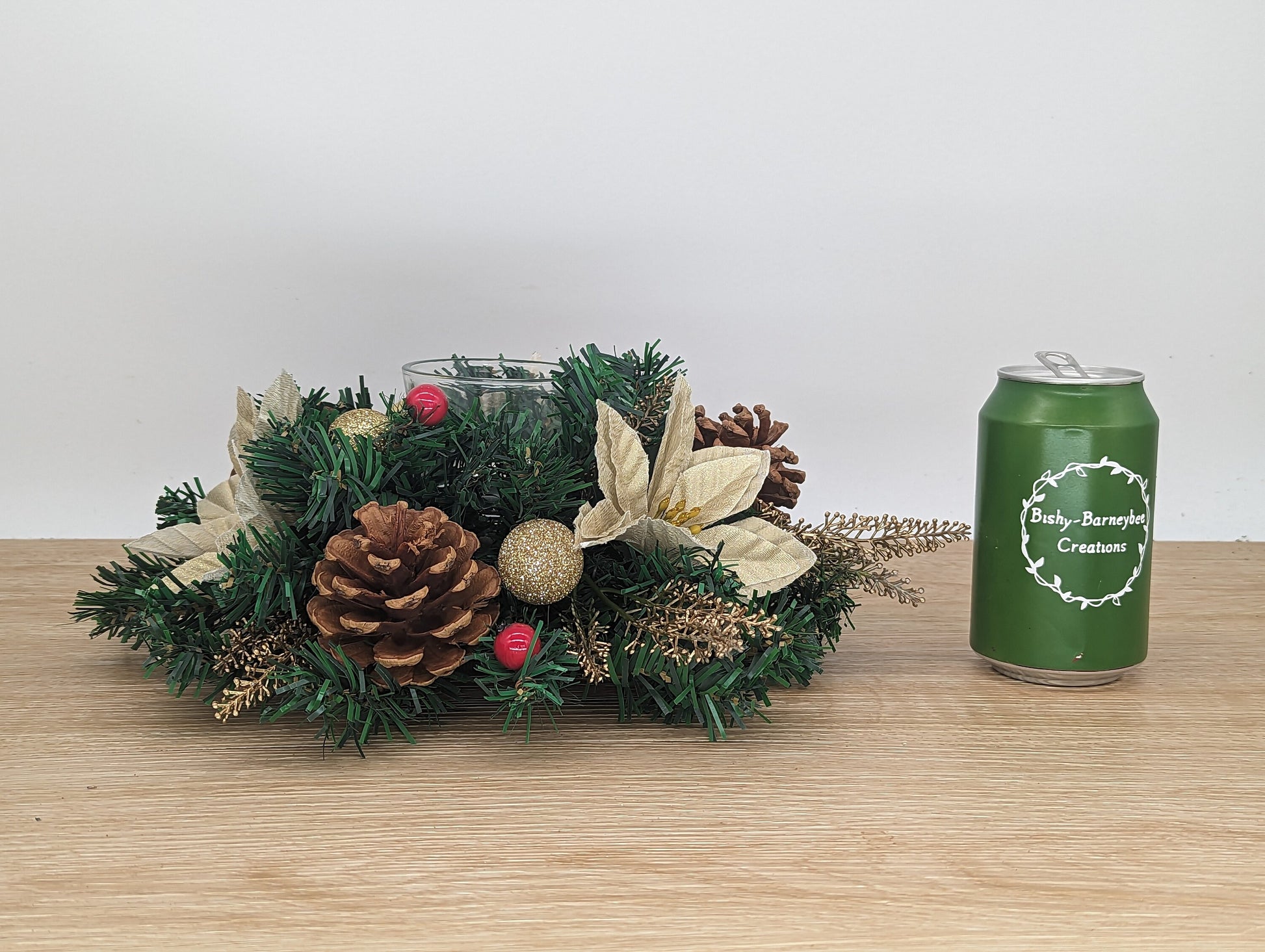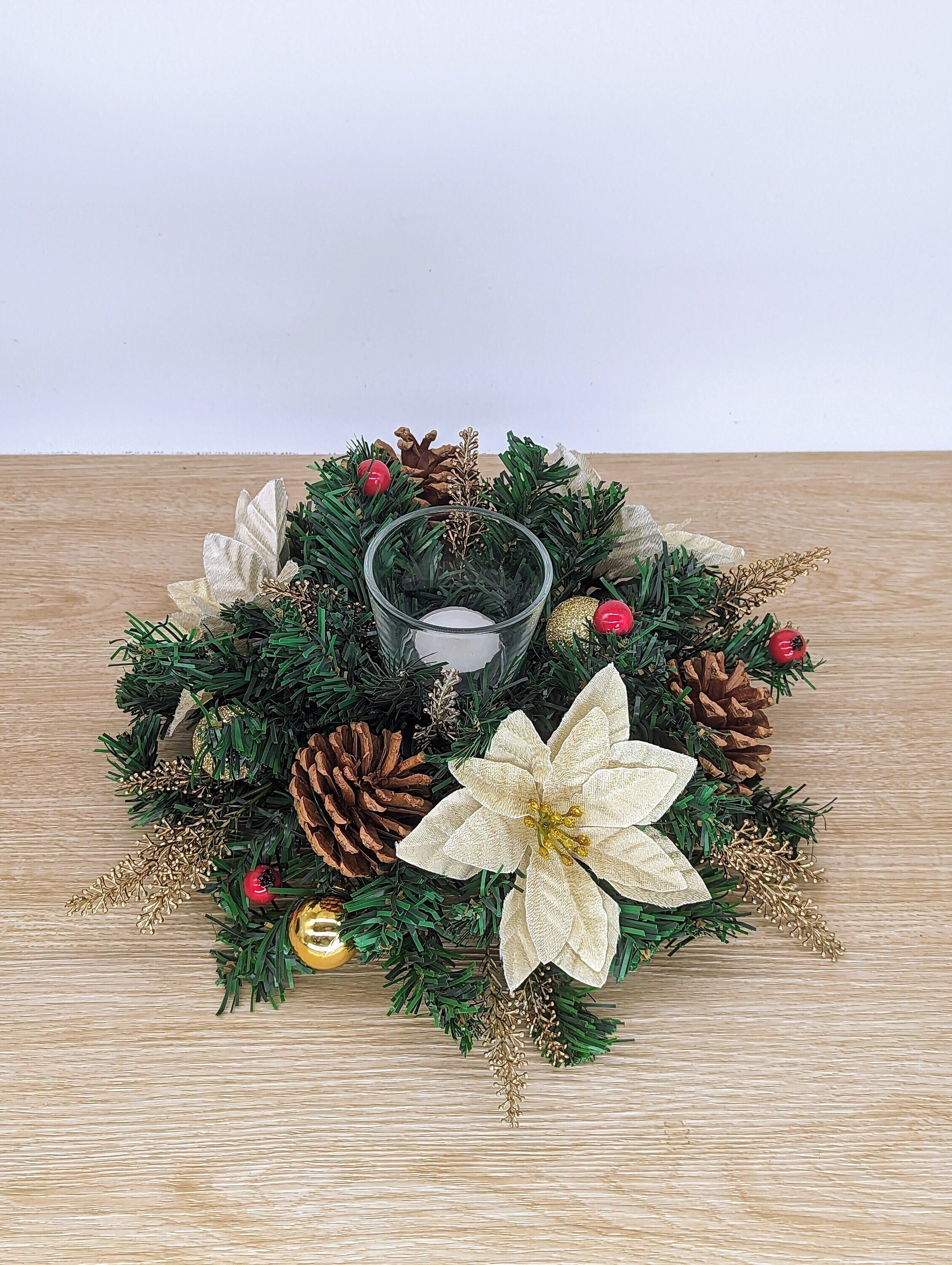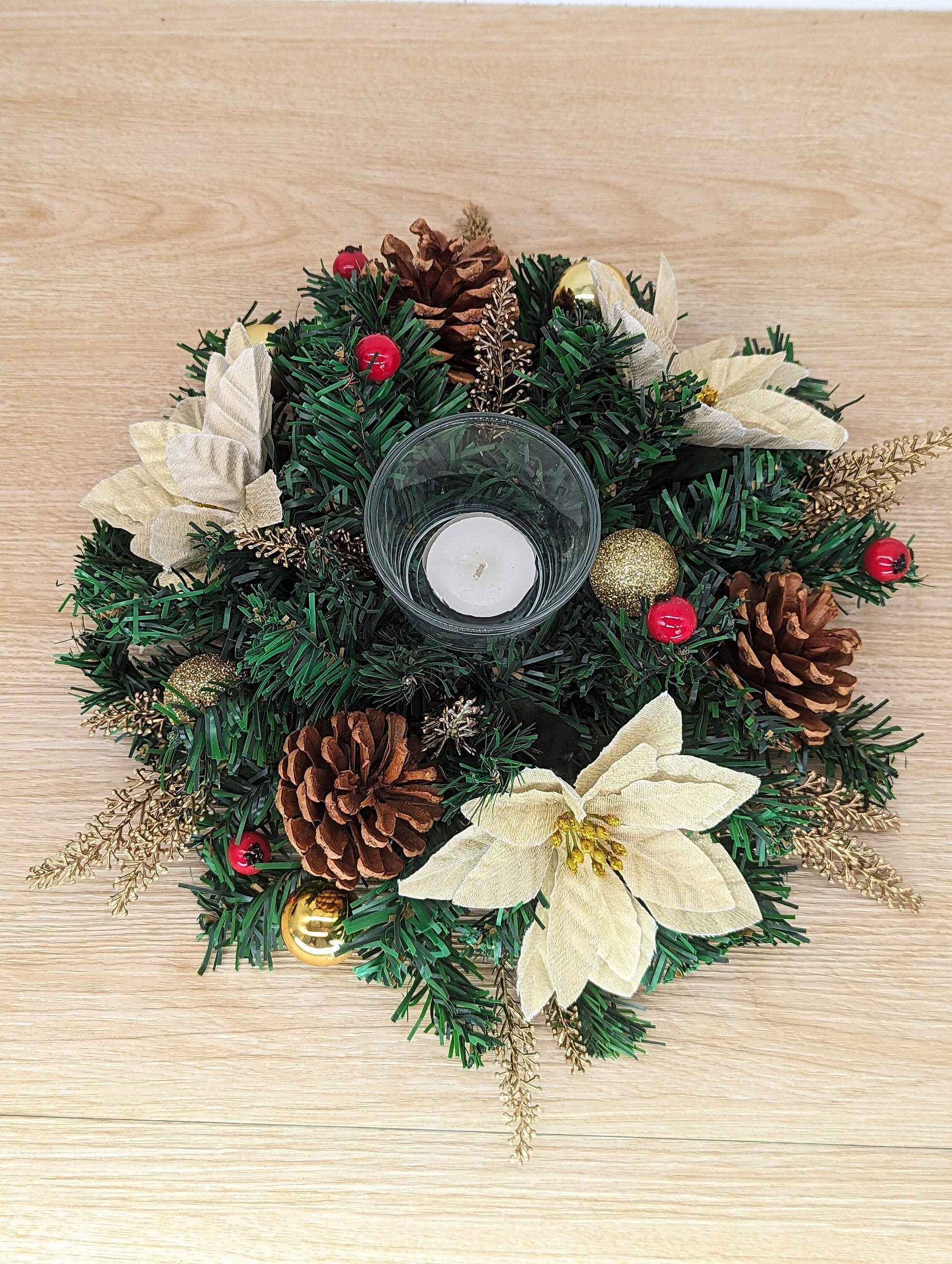 This beautiful Gold Poinsettia Christmas Table Centrepiece is the perfect addition to any holiday table. Place it on a hall sideboard, coffee table, or windowsill to add festive decoration. The centrepiece features Cream/Gold Poinsettia, Gold Baubles, Real Pinecones, Gold Heather, and Red Berry details, all on a realistic artificial Christmas Tree base. At the center of the arrangement is a votive Candle Holder with a tea light Candle. Measuring approximately 28cm in diameter and 12cm tall, this Table Decoration is sure to catch the eye. Please note that the shape of the Votive holder may vary but will always be clear glass.