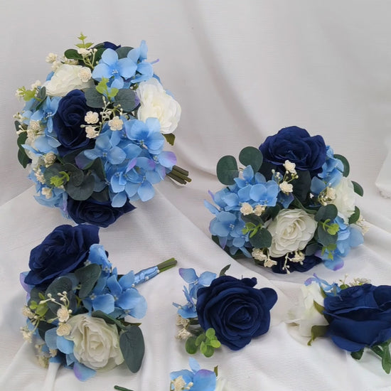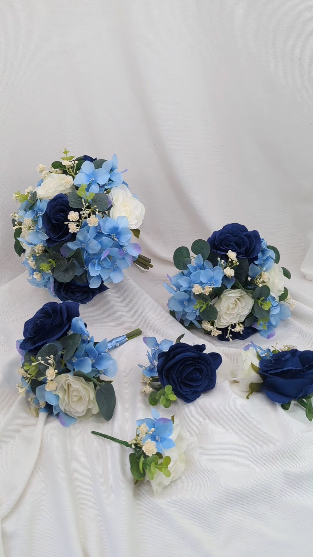This elegant Blue Wedding Flowers features beautiful Ivory and Blue Rose, Blue Hydrangea, dainty Gypsophila, and Eucalyptus Foliage. The Faux wedding flowers collection encompasses a Bridal Bouquet, Buttonhole, Corsage, all expertly crafted by a certified Florist using traditional methods. Unlike fresh flowers, the realistic artificial ones used in these designs provide the enduring advantage of being a cherished memento from your memorable occasion.