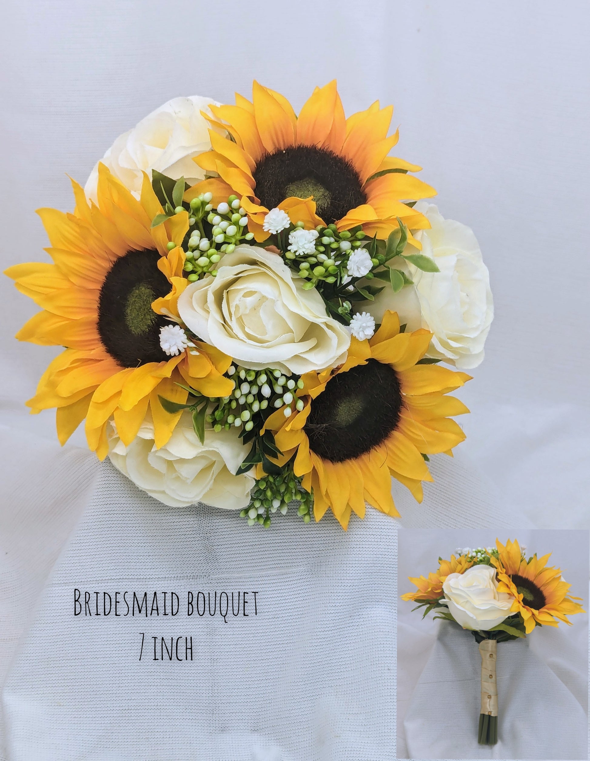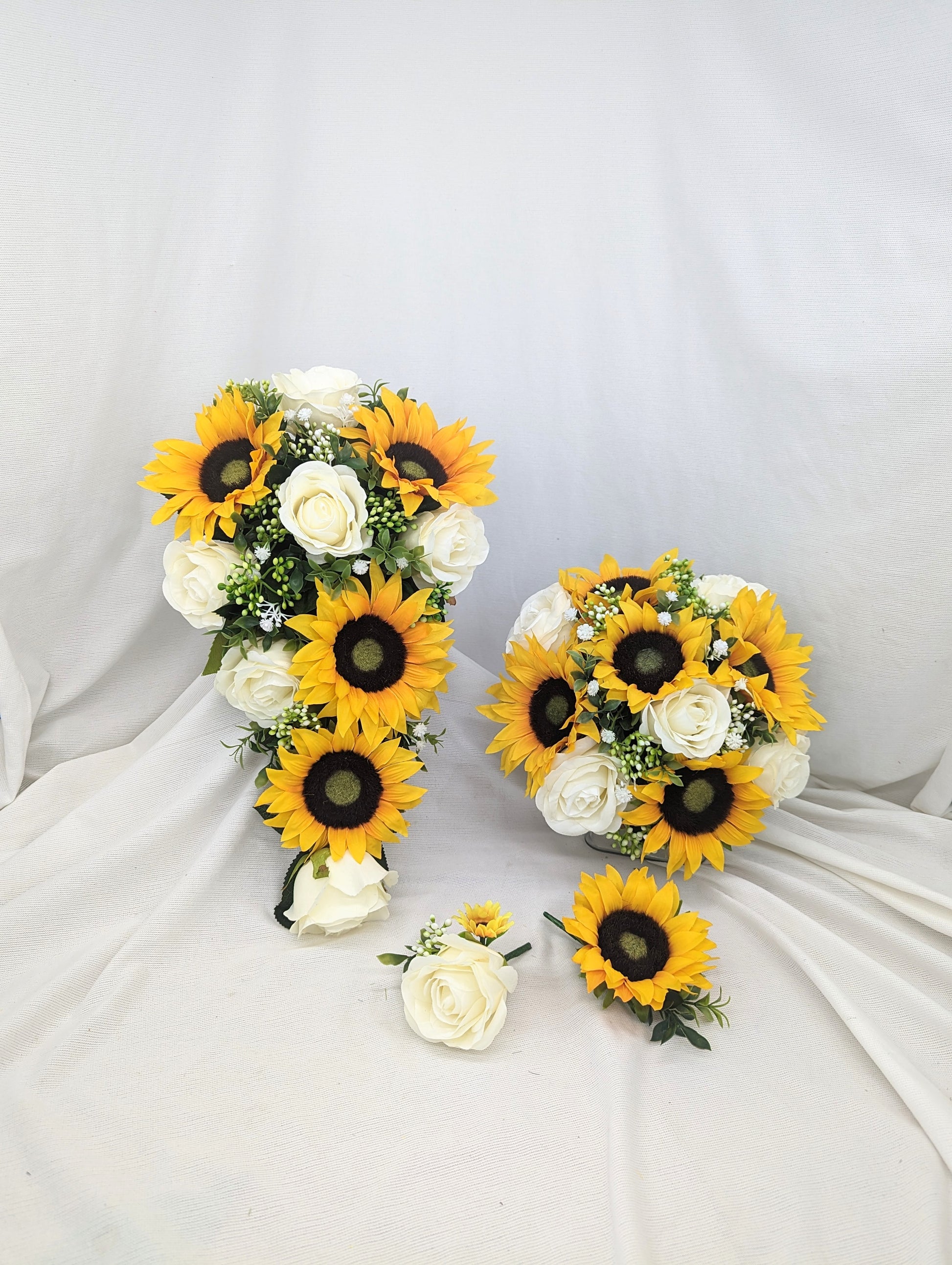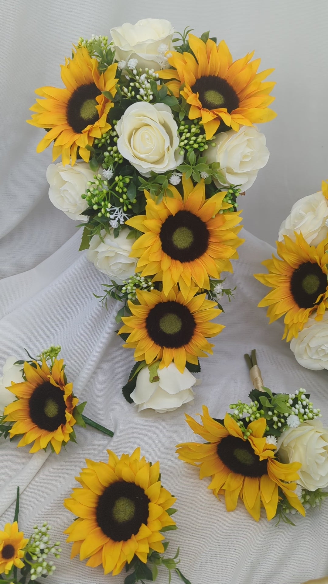 This beautiful bright wedding set features Sunflowers and Ivory Rose with Gypsophila, Berries and Foliage. Each item is handmade in the UK by a fully Qualified Florist using the same techniques as fresh flowers, however the realistic artificial flowers used in these designs have the advantage of being an ever lasting keepsake from your wedding day.