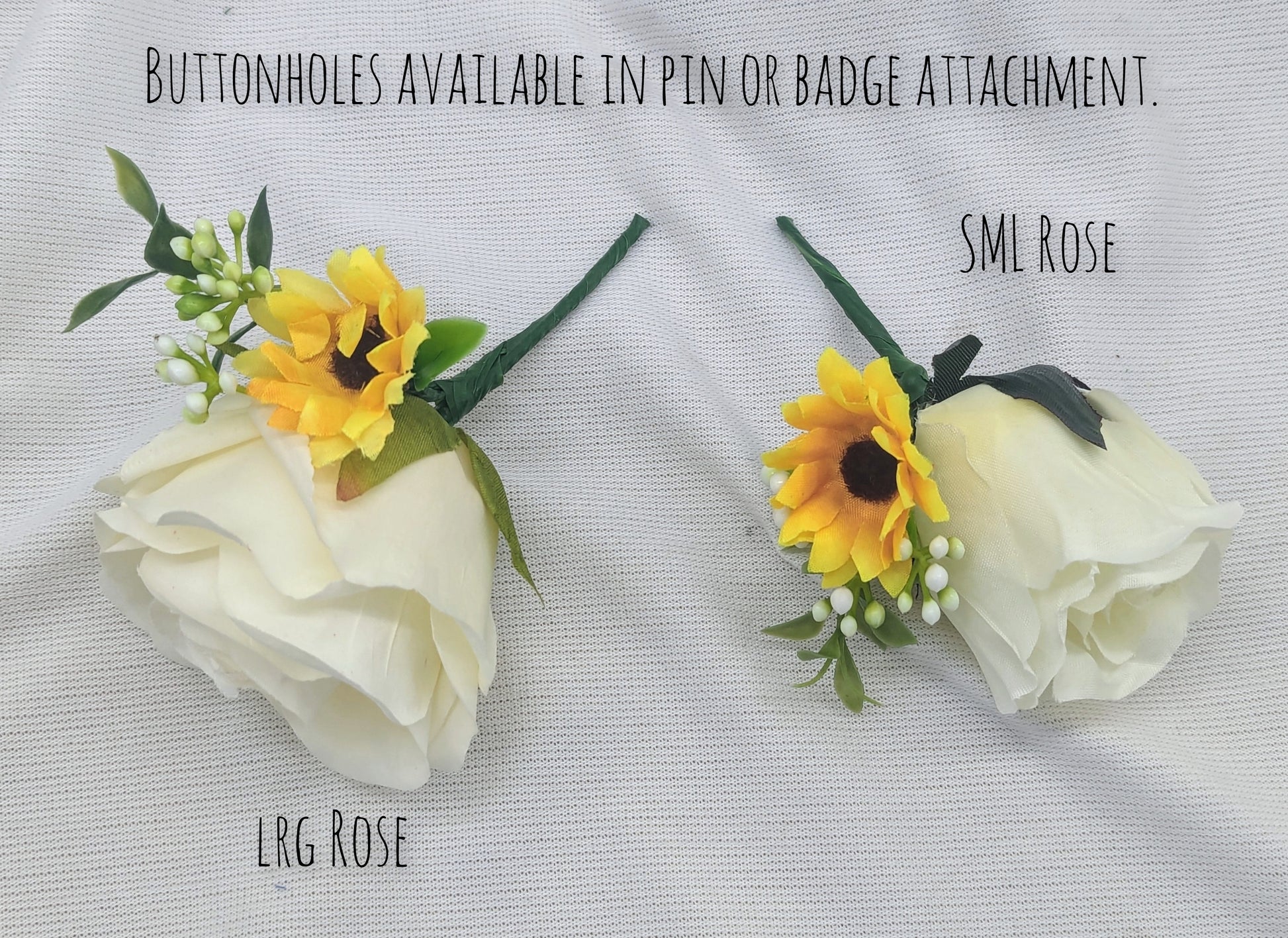 Large Rose Buttonhole - Includes an Ivory Rose and small sunflower with Berries and foliage, the stem is fully taped and is supplied with either an Ivory pearl pin to fasten to a jacket or a badge back style fastening. The flower measures approximately 3.5 inches plus the stem. This Buttonhole costs £5.00 with a pin fastening
