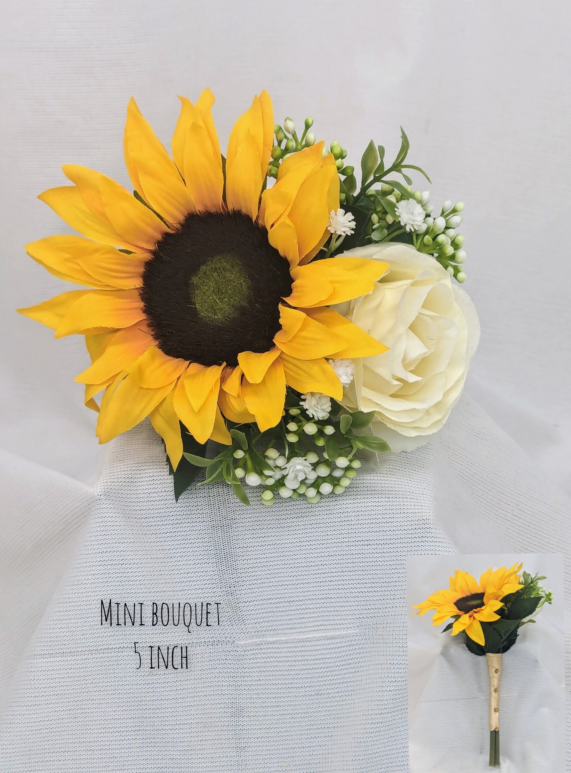 Mini Bouquet - Measures approximately 13cm (5 inches) in diameter and includes a Sunflower, Ivory Rose, Gypsophila, Berries and foliage. The handle is wrapped in Antique Gold Satin ribbon and has Gold pearl pin details. This Bouquet costs £14.50.
