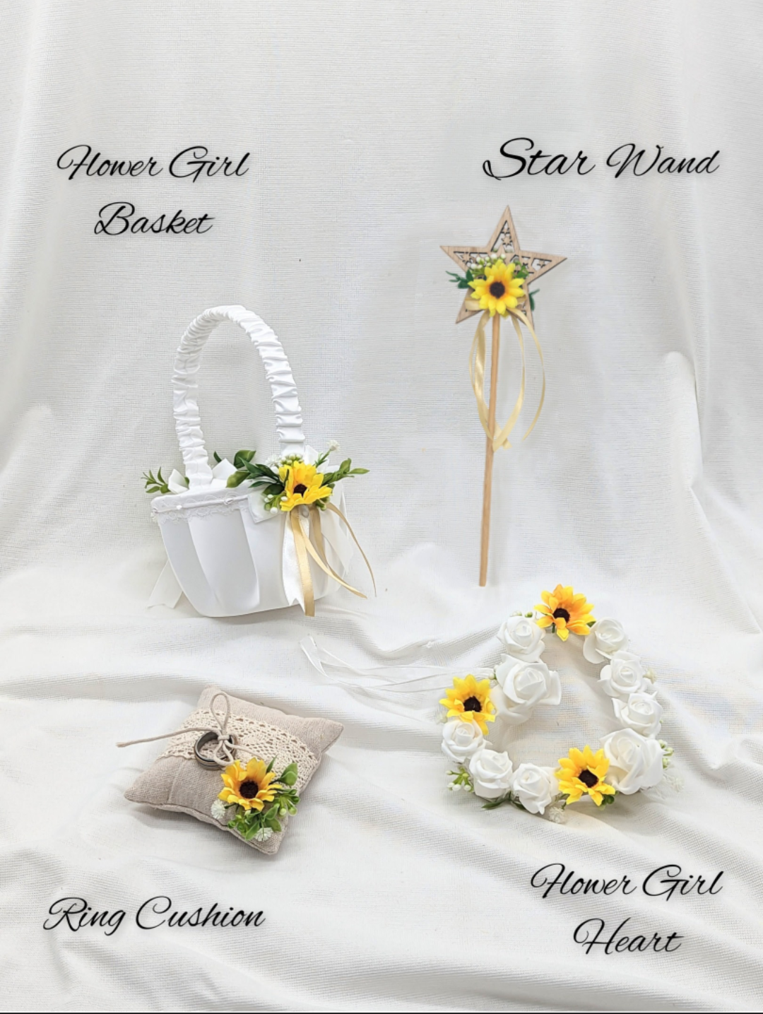 Flower Girl Heart - A wire heart frame with white Foam roses, mini Sunflowers and foliage details. The handle is white organza ribbon. The heart measures approximately 6x6 inches. This Heart costs £9.00.