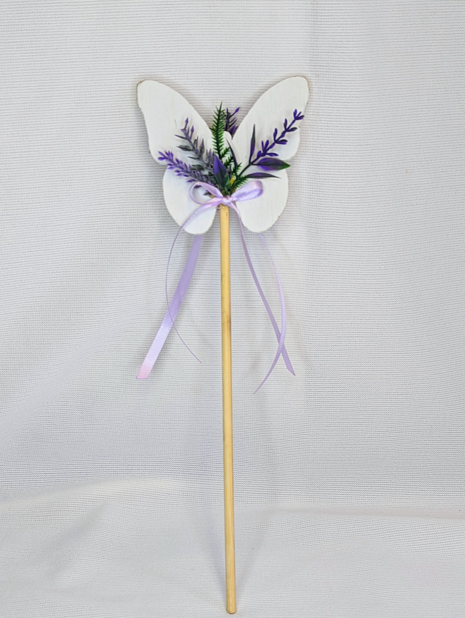 Flower Wand - The Butterfly Flower Wand is made from a wooden Butterfly shape with whitewash paint finish decorated with small pieces of lavender and foliage detail to both sides with hanging Lilac Satin ribbon.
