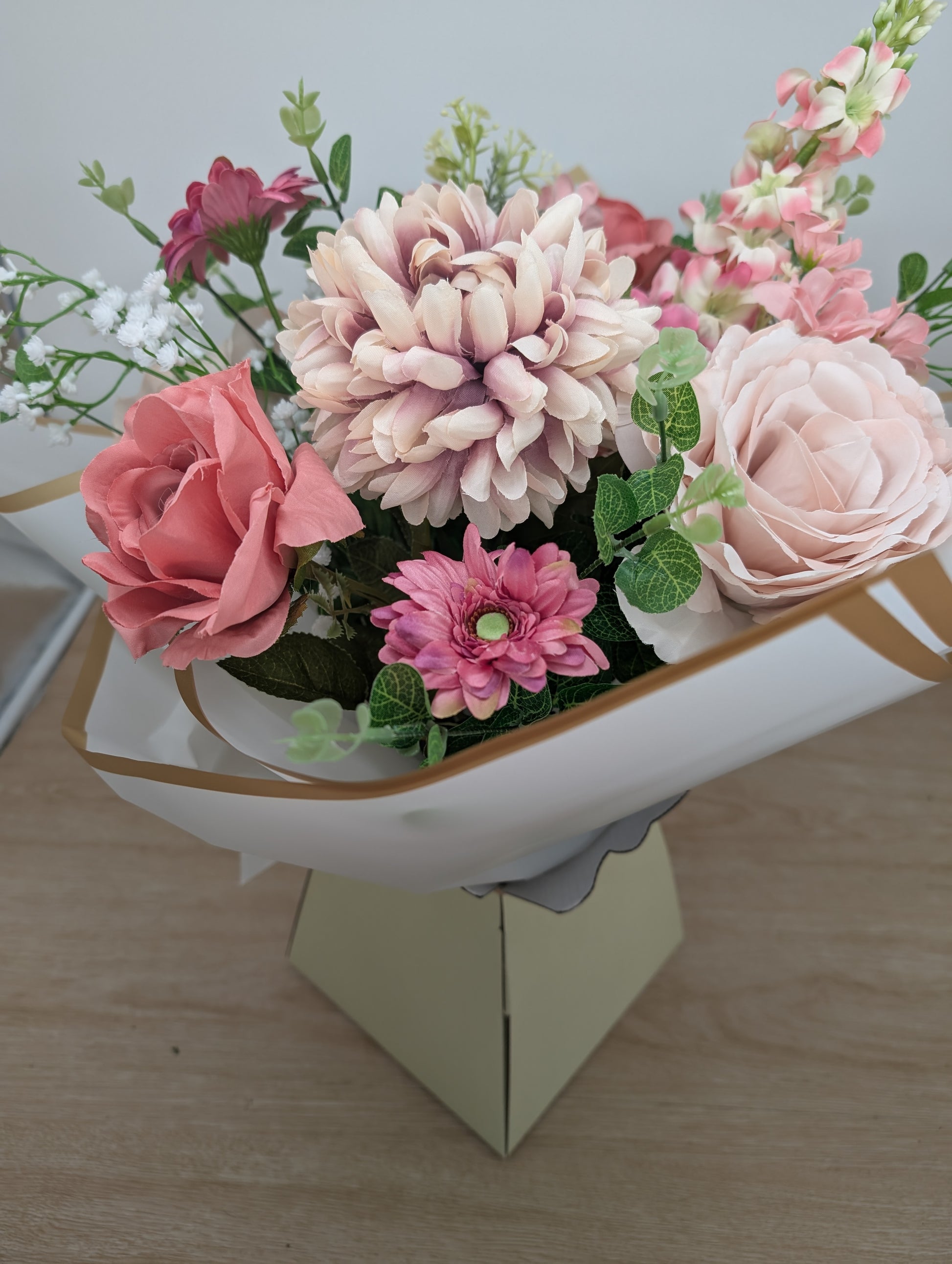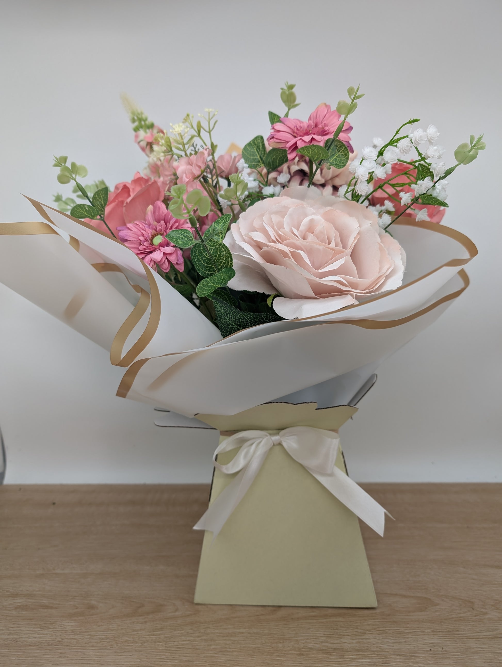 This Pale Pink Artificial Flower Bouquet is suitable for both gifting and personal indulgence. It features a variety of exquisite floral species, expertly arranged in a box and carefully wrapped in cellophane. You have the option to either leave them in the packaging or showcase them in your own vase. The bouquet includes roses, alstromeria, daisy, gerbera, bloom chrysanthemum,delphinium, and eucalyptus foliage.