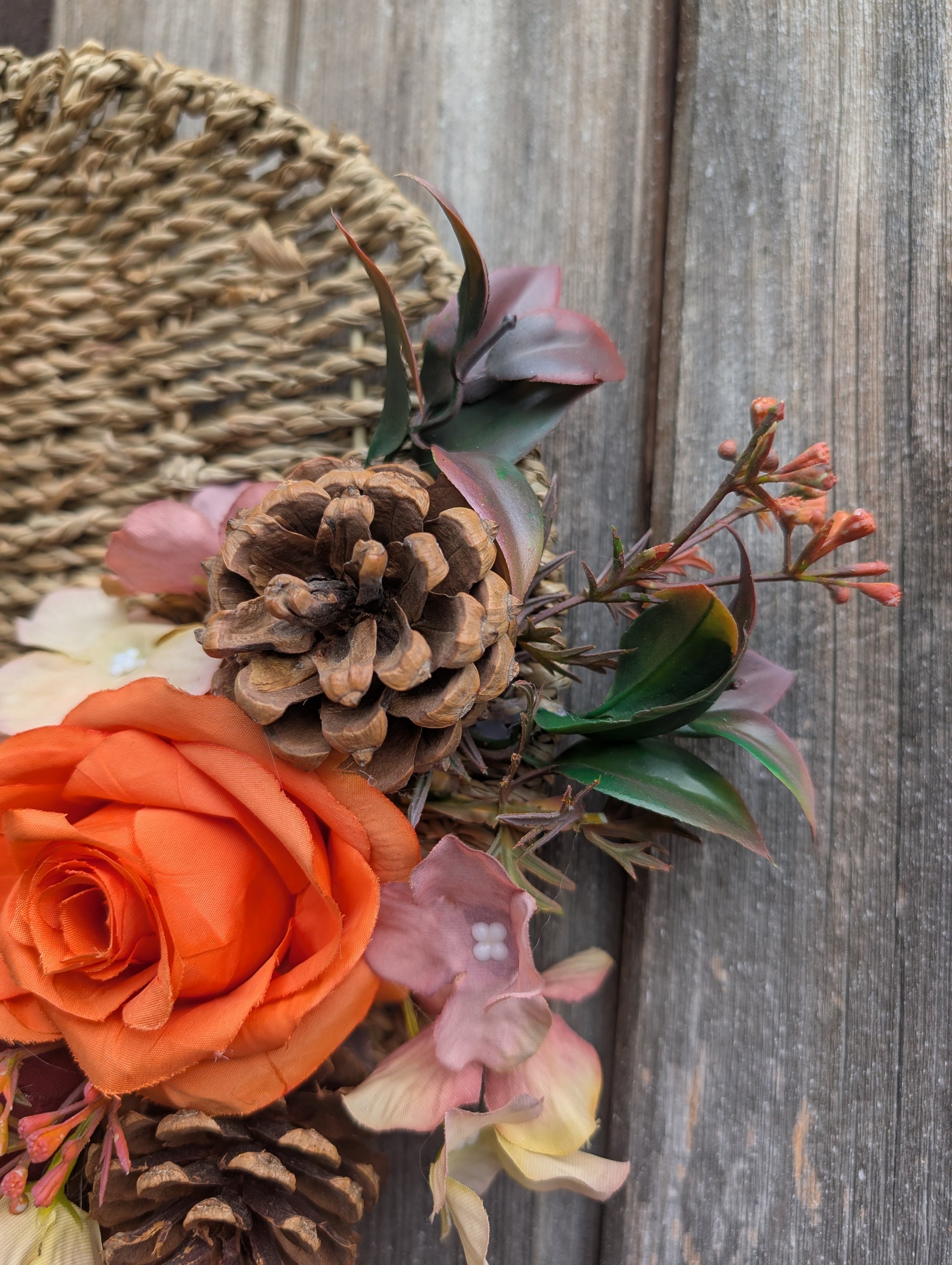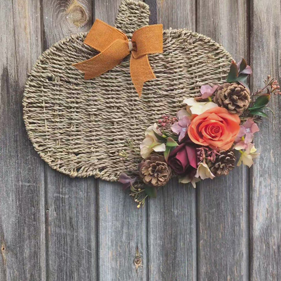 Add a touch of autumn elegance to your home with this artificial Woven Seagrass Pumpkin door decoration. Featuring a rich arrangement of orange and burgundy roses, hydrangea waxflowers, pinecones, and ruscus foliage, it brings seasonal warmth and texture to any kitchen wall or door. The decoration is finished with an orange hessian bow, measuring 30cm tall and 40cm wide, making it a perfect size to enhance your autumn décor.