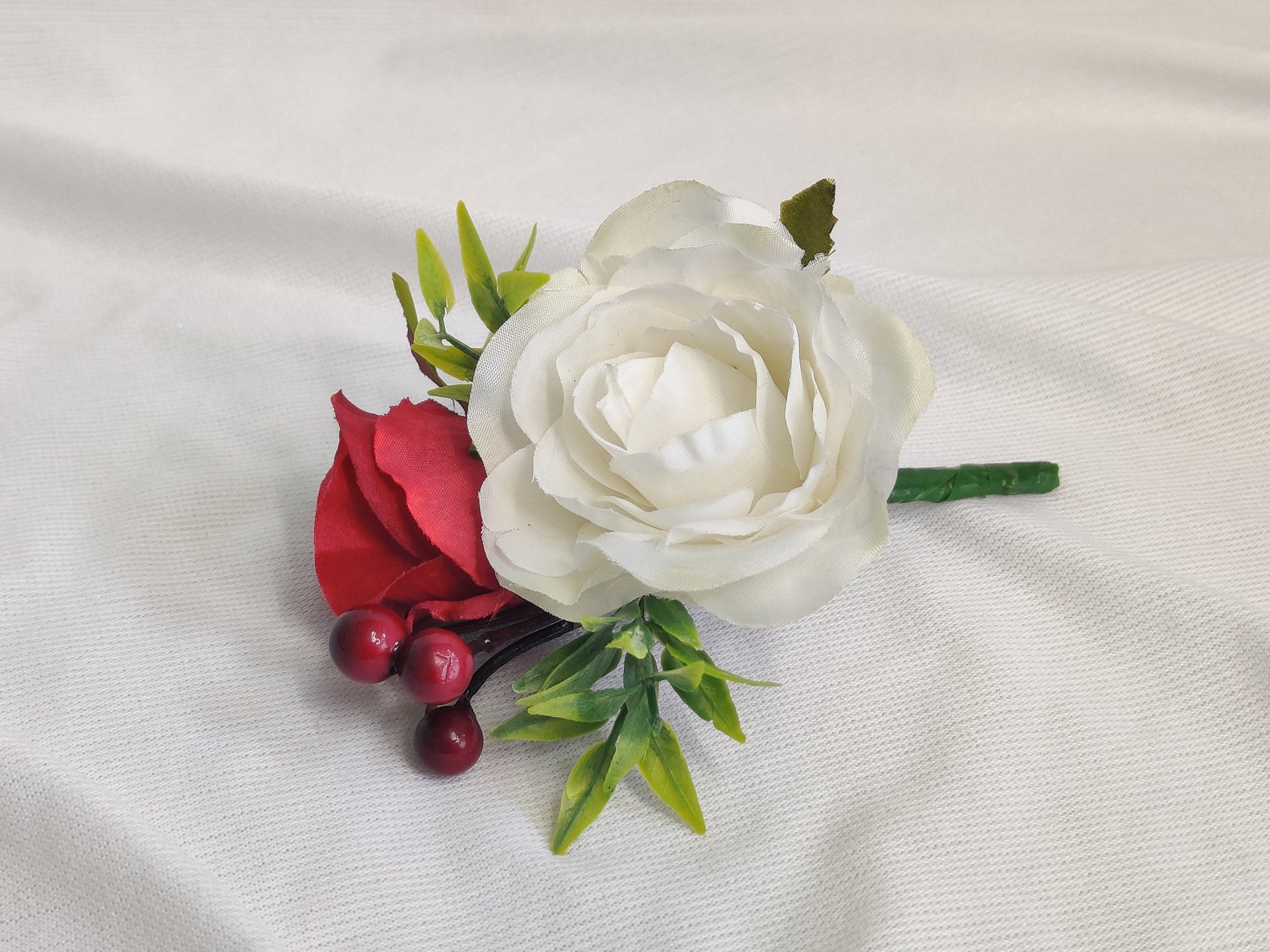 Ladies Corsage - Has an Ivory Rose and a Red Rose with Berries and foliage, just like the Buttonhole the stem is fully taped and is supplied with a pearl pin.
