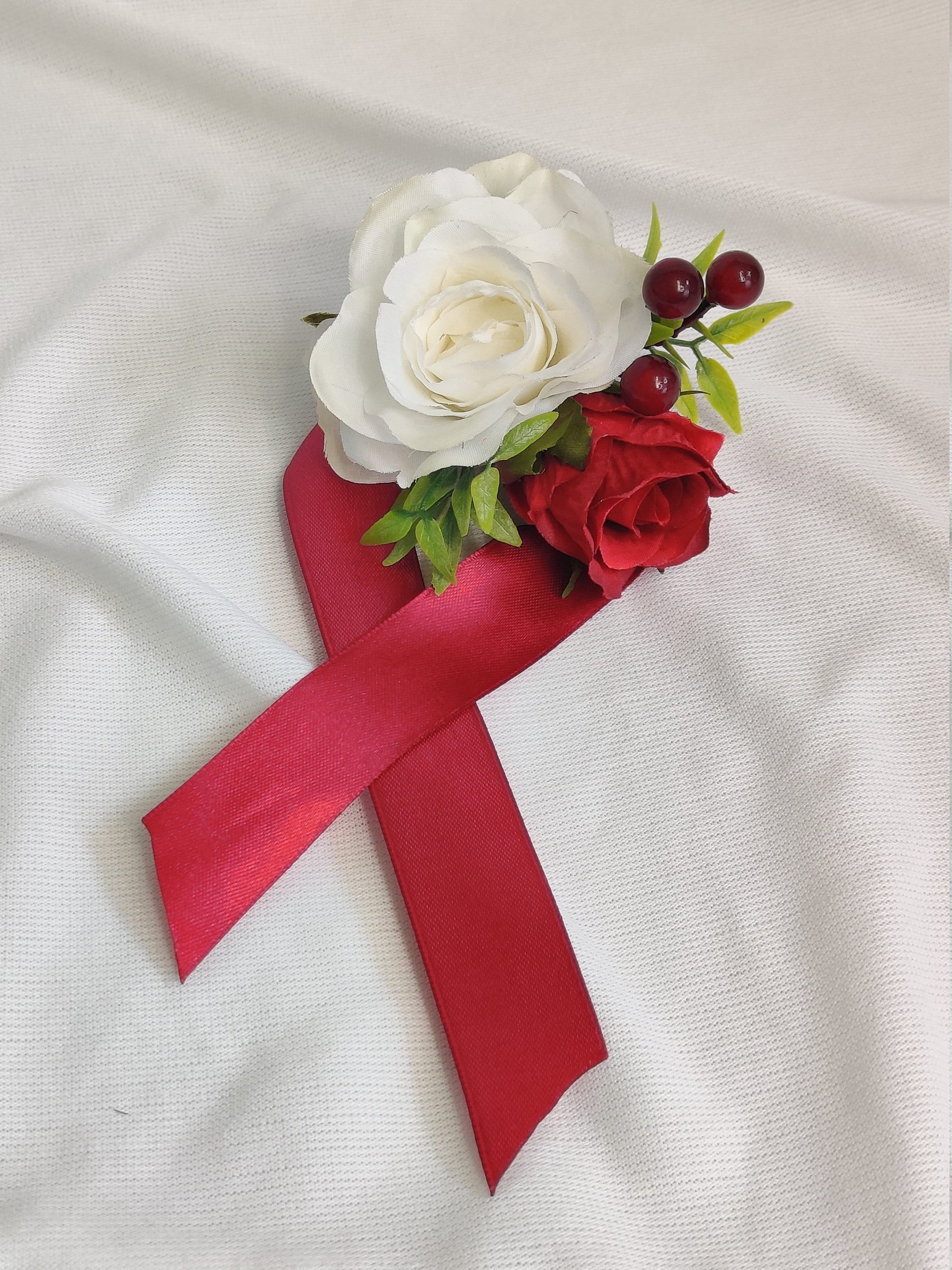 Wrist Corsage - Has one Ivory Rose and one Red Rose with Berries and foliage and is supplied with a deep Red satin ribbon for tying around a wrist.