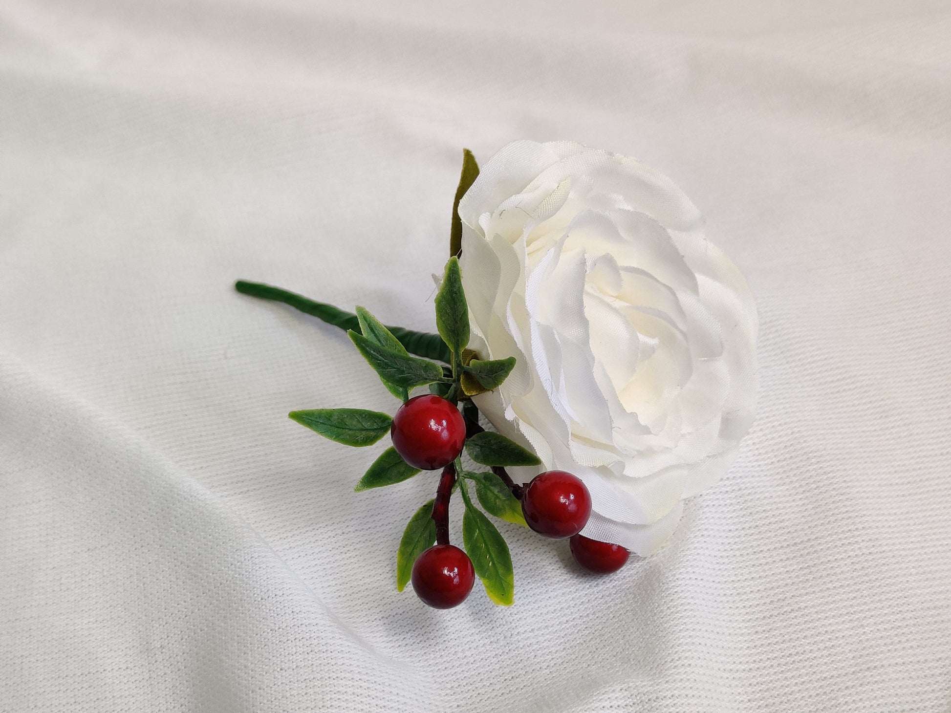 Buttonhole - Includes an Ivory Rose with Berries and foliage, the stem is fully taped and is supplied with a pearl pin to fasten to a jacket.