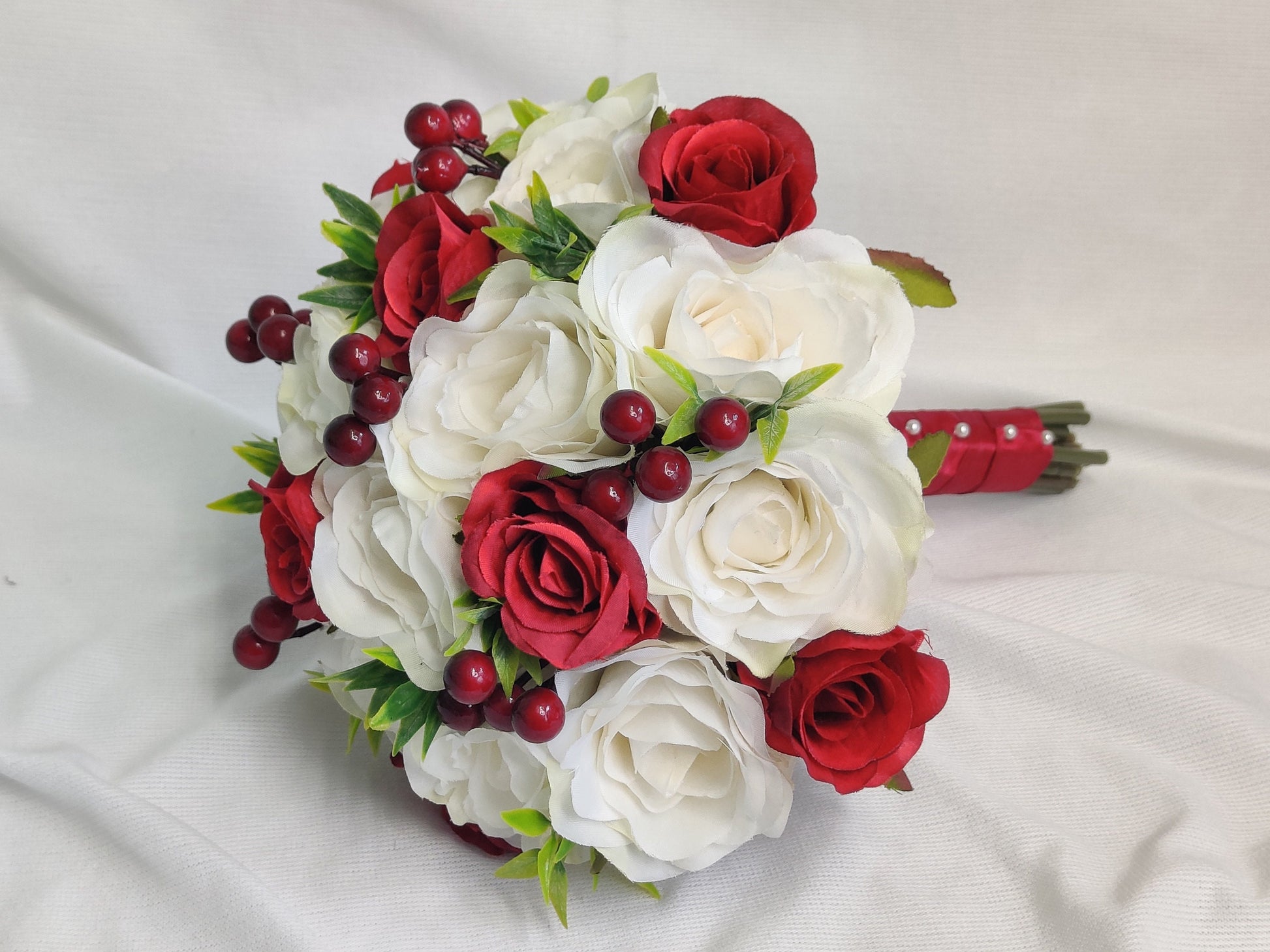 Brides Bouquet - Measures approximately 23cm (9 inches) in diameter and includes Red & Ivory Roses, Red Berries and foliage. The handle is wrapped in a deep Red Satin ribbon and has pearl pin details.