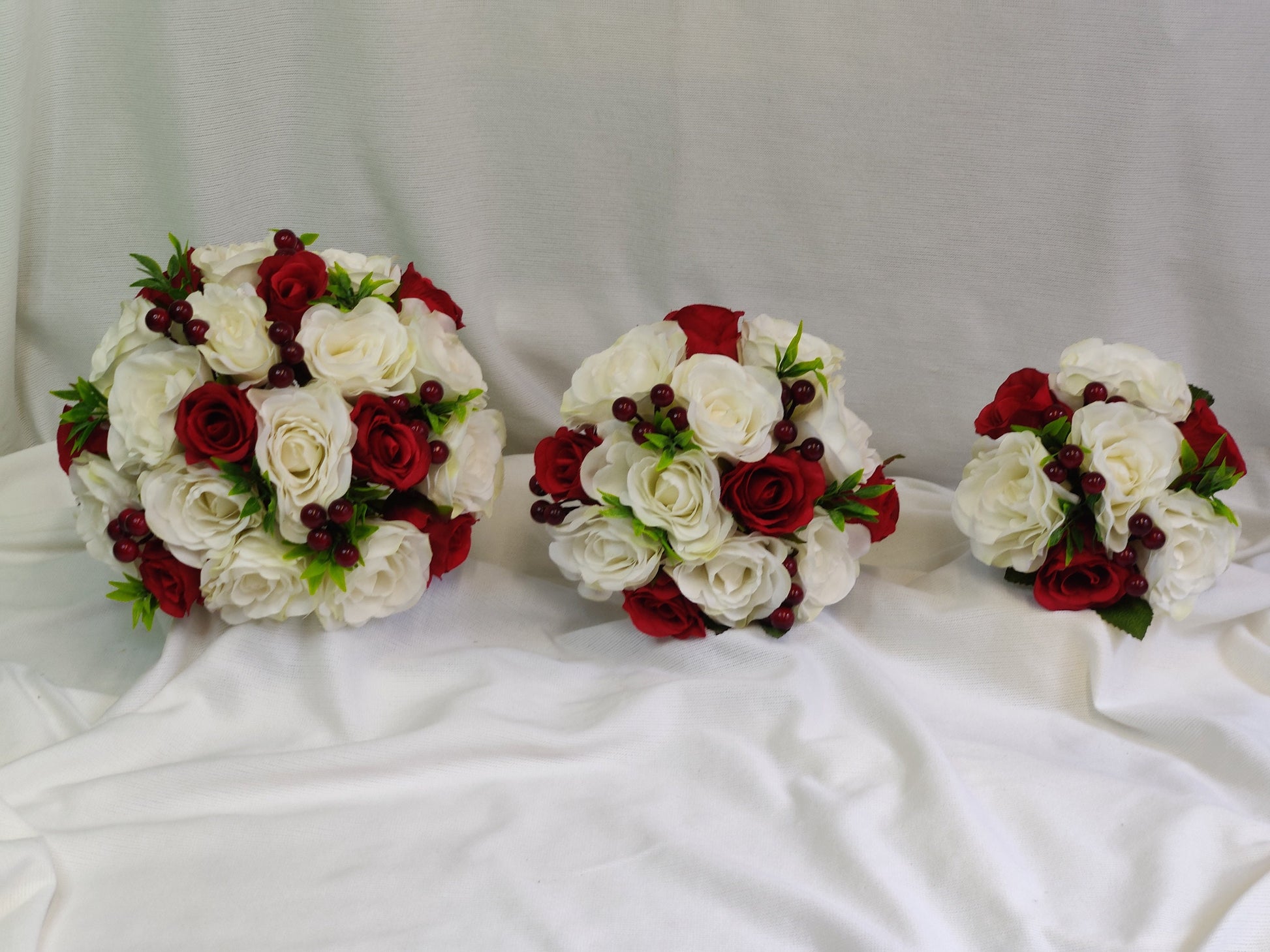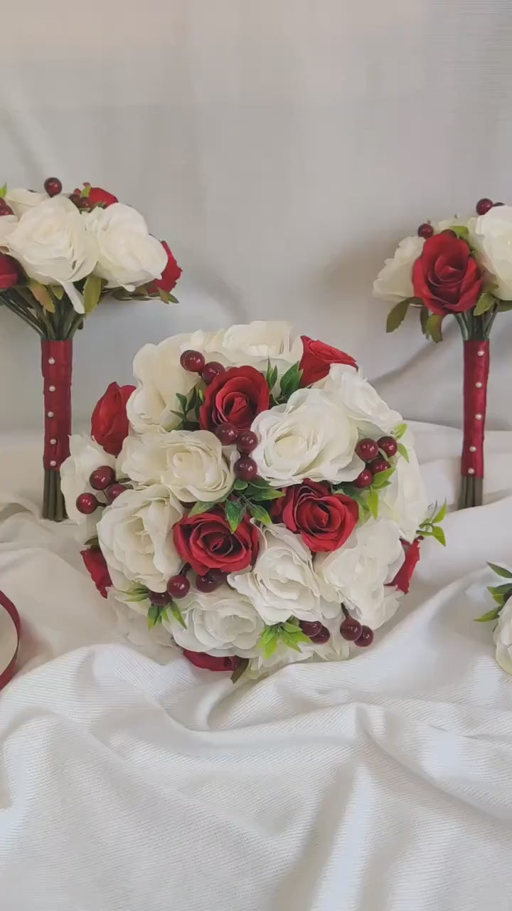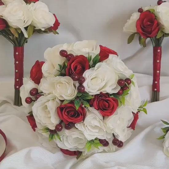 This set of Red Wedding Flowers showcases stunning Ivory and Red Roses adorned with Berries and Foliage, perfect for a Christmas or Winter themed wedding. Included are faux Bridal Bouquet, Bridesmaids Bouquets, Buttonhole, Corsage, and Flower Wand, all handmade in the UK by a fully Qualified Florist using the same techniques as fresh flowers. The realistic artificial flowers used in the Rose Bouquet designs offer the added benefit of being a cherished keepsake from your special day.