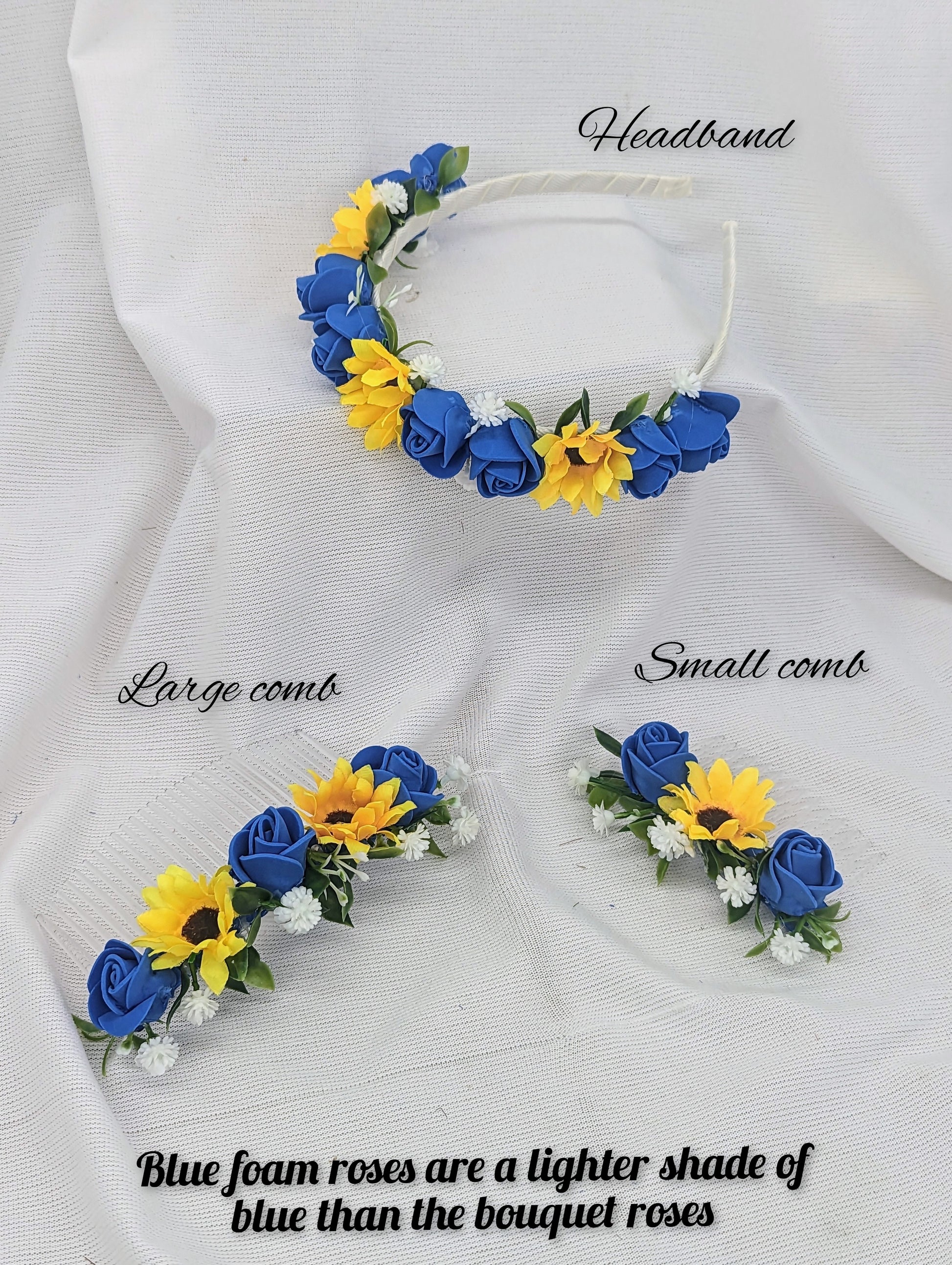 Headband - Has blue Foam roses and small sunflowers with Gypsophila and foliage details. The headband is covered in Ivory grosgrain ribbon. The headband is a universal size suitable for adults and children. The headband costs £12.50.