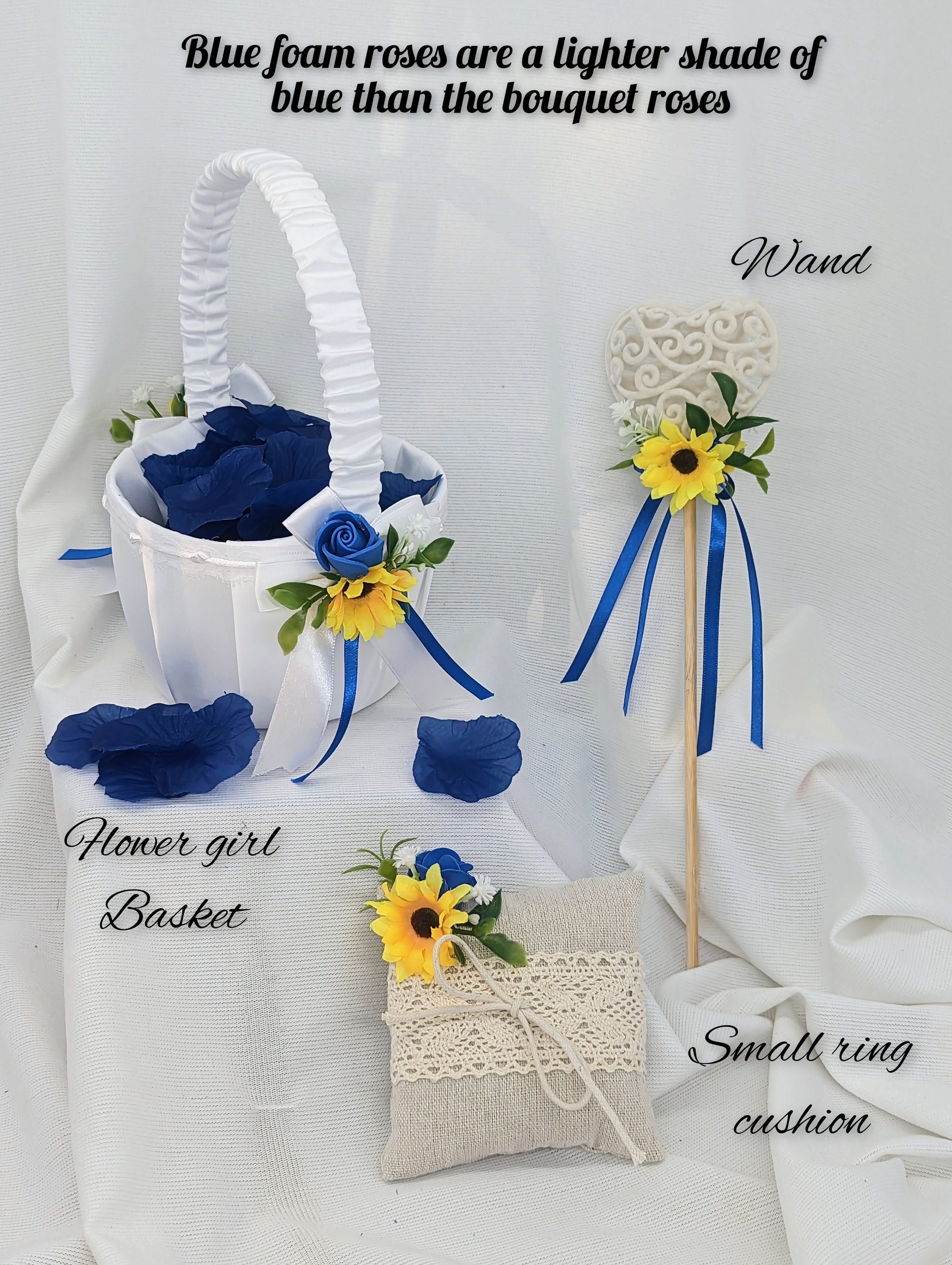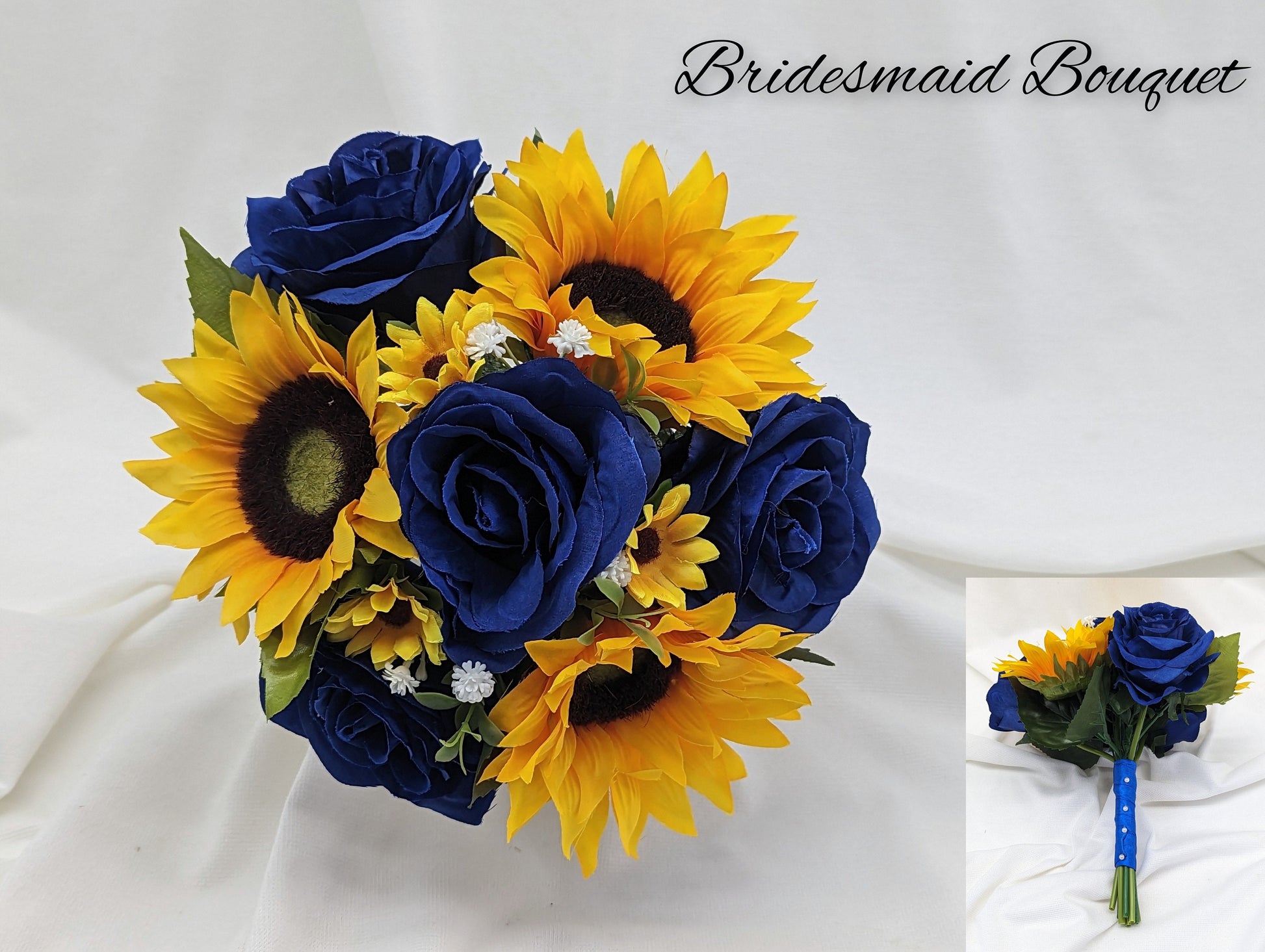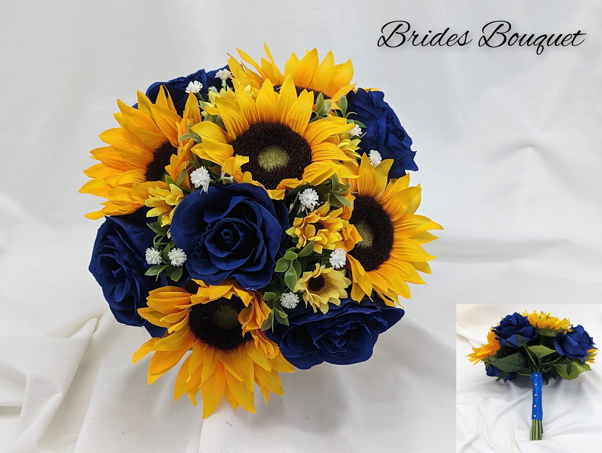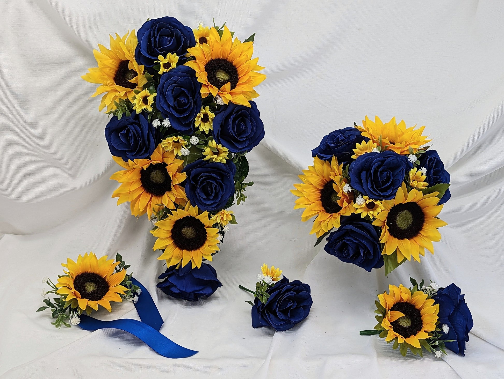 This beautiful bright wedding set features Sunflowers and Blue Rose with Gypsophila and Foliage. Each item is handmade in the UK by a fully Qualified Florist using the same techniques as fresh flowers, however the artificial flowers used in these designs have the advantage of being an everlasting keepsake from your wedding day.