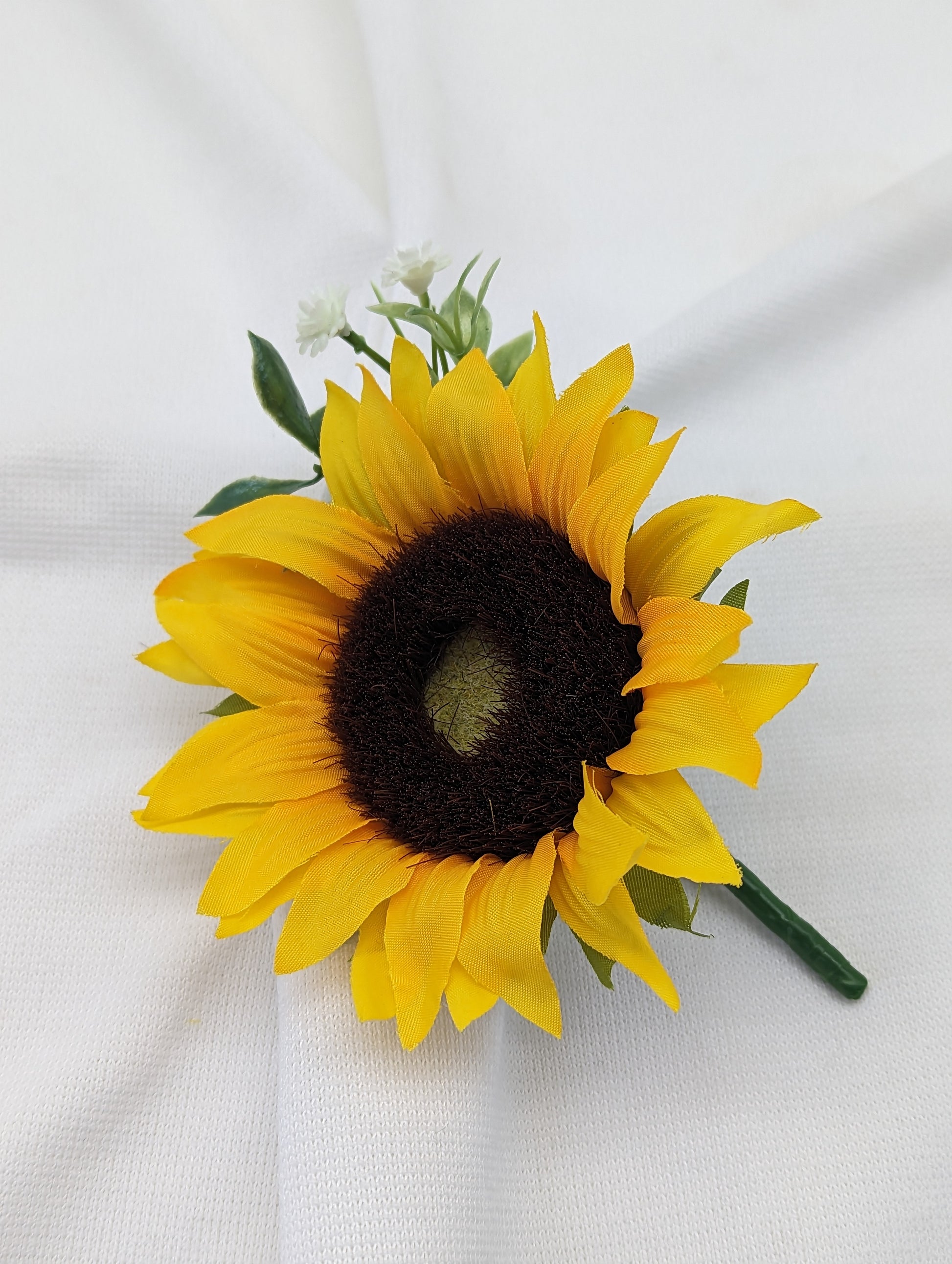 Sunflower Buttonhole - Includes a Sunflower with Gypsophila and foliage, the stem is fully taped and is supplied with an Ivory pearl pin to fasten to a jacket. The flower measures approximately 3.5 inches plus the stem. This Buttonhole cost £5.00