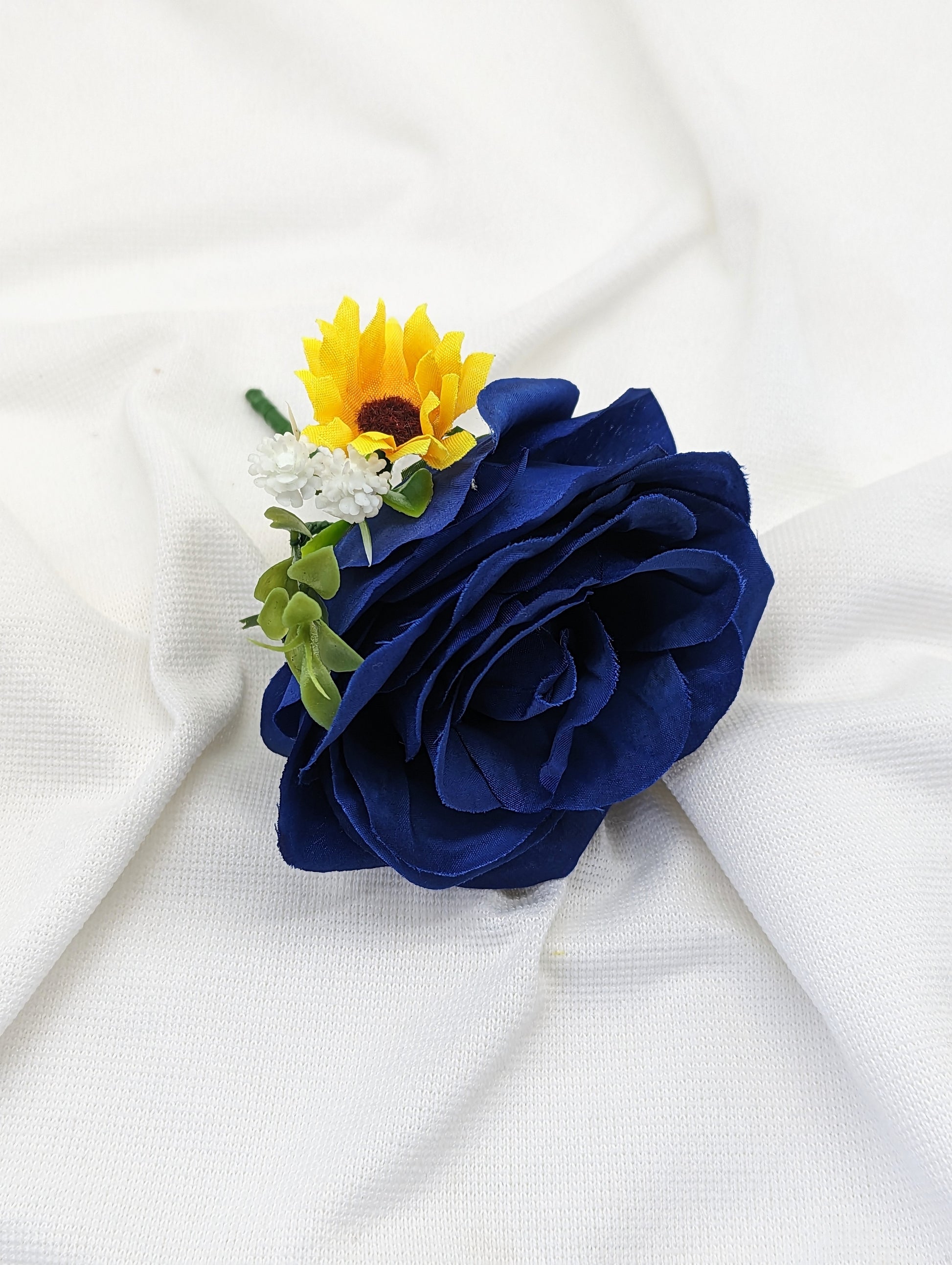 Rose Buttonhole - Includes a Blue Rose and small sunflower with Gypsophila and foliage, the stem is fully taped and is supplied with an Ivory pearl pin to fasten to a jacket. The flower measures approximately 3.5 inches plus the stem. This Buttonhole cost £5.00