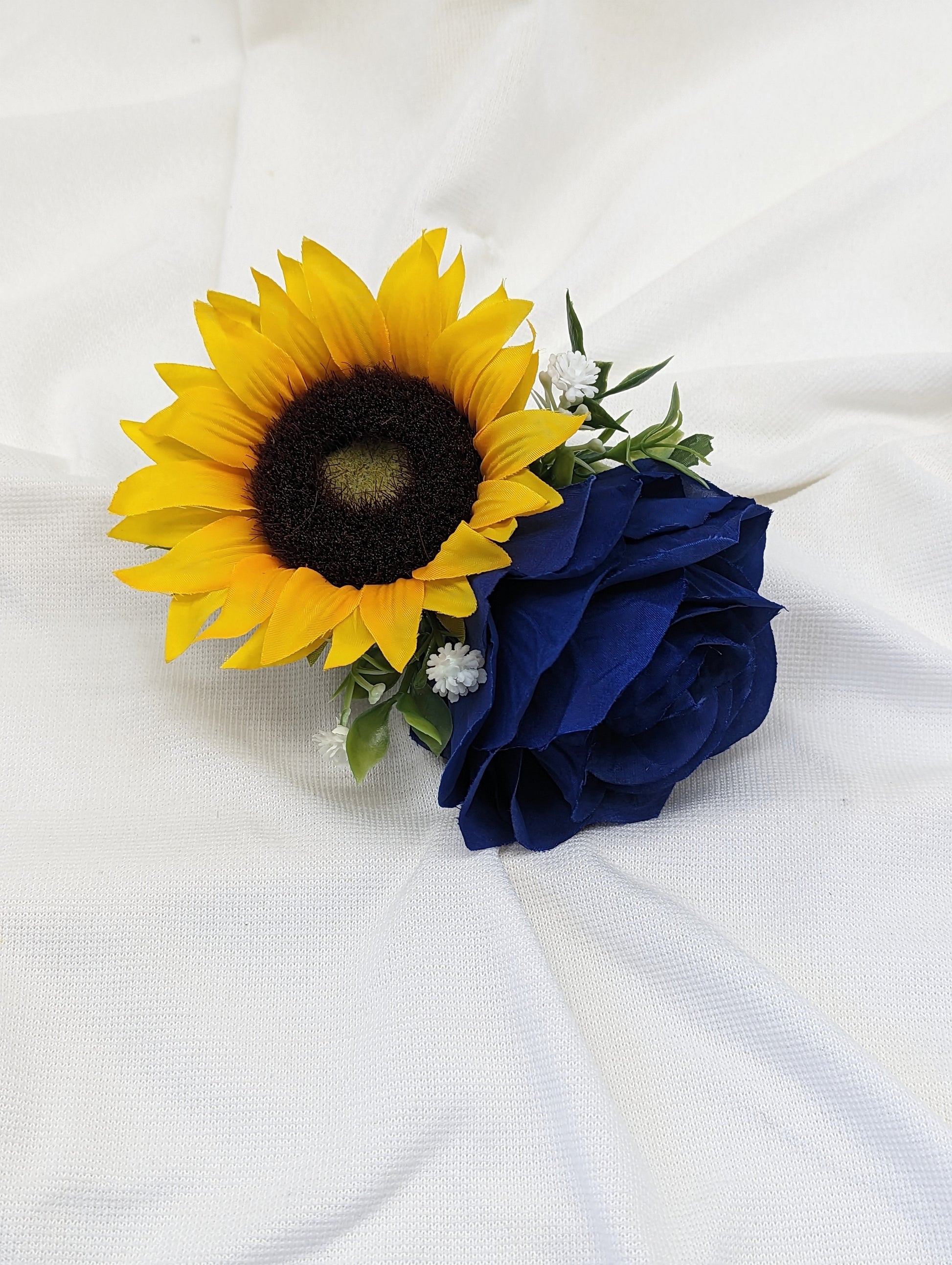 Ladies Corsage - Has a Blue Rose and Sunflower with Gypsophila and foliage, just like the Buttonhole the stem is fully taped and is supplied with an Ivory pearl pin. The flowers measures approximately 5 inches long plus the stem and 3.5 inches wide. This corsage costs £7.00