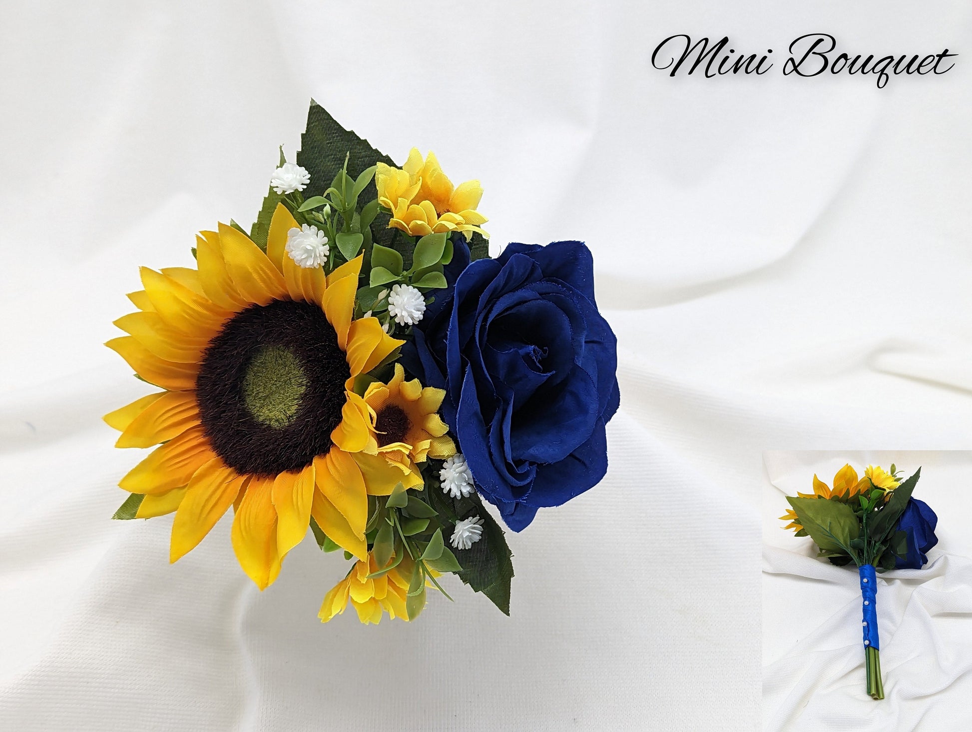 Mini Bouquet - Measures approximately 13cm (5 inches) in diameter and includes a Sunflower, Mini Sunflowers, Blue Rose, Gypsophila and foliage. The handle is wrapped in Blue Satin ribbon and has Ivory pearl pin details. This Bouquet cost £14.50