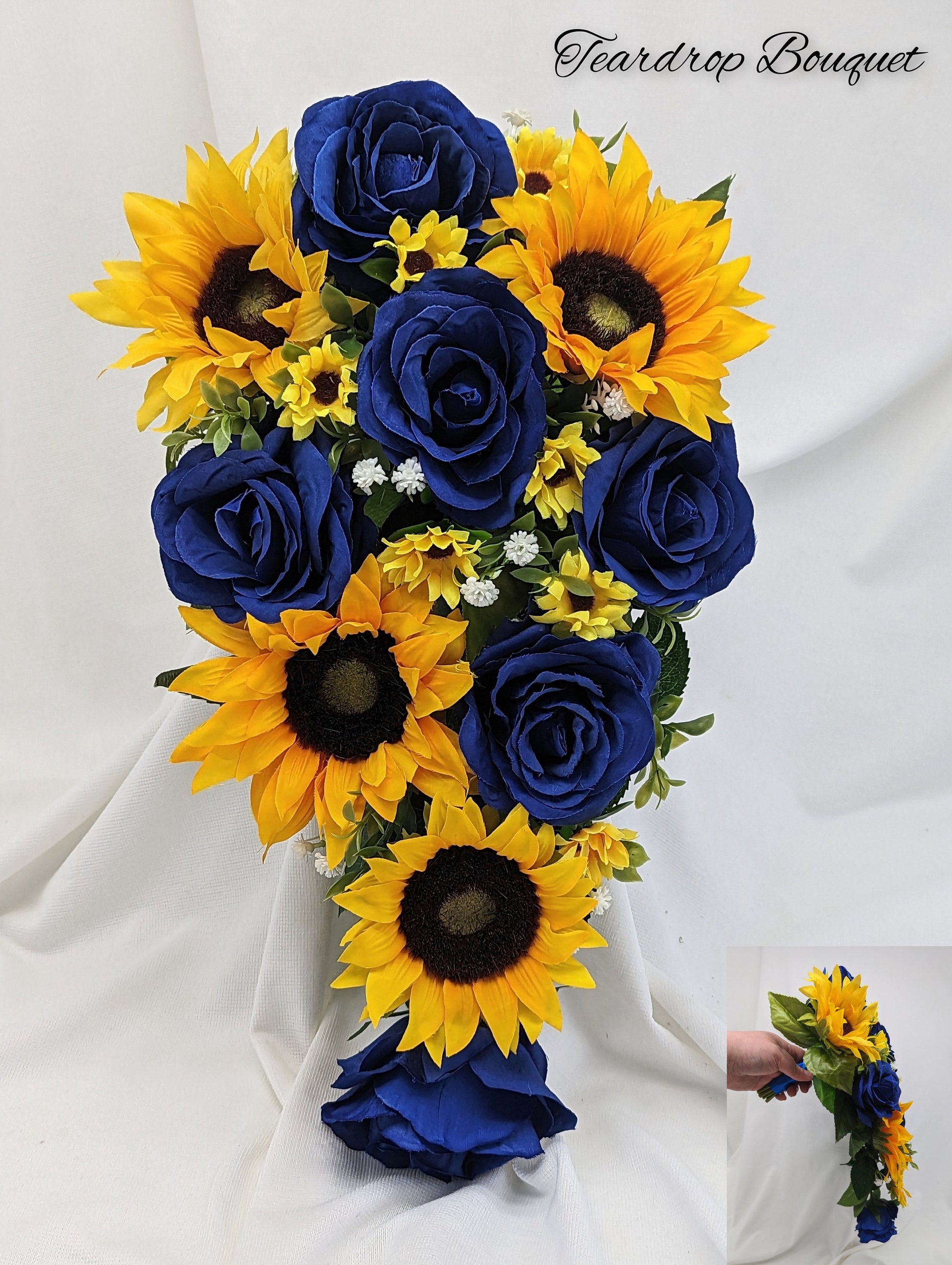 Teardrop Bouquet - Measures approximately 38cm (16 inches) long and 23cm (9 inches) wide and includes Sunflowers, Mini Sunflowers, Blue Roses, Gypsophila and foliage. The handle is wrapped in Blue Satin ribbon and has Ivory pearl pin details. This Bouquet cost £52.00