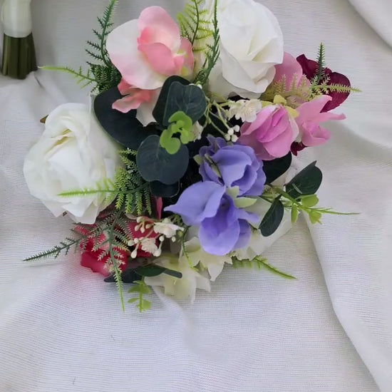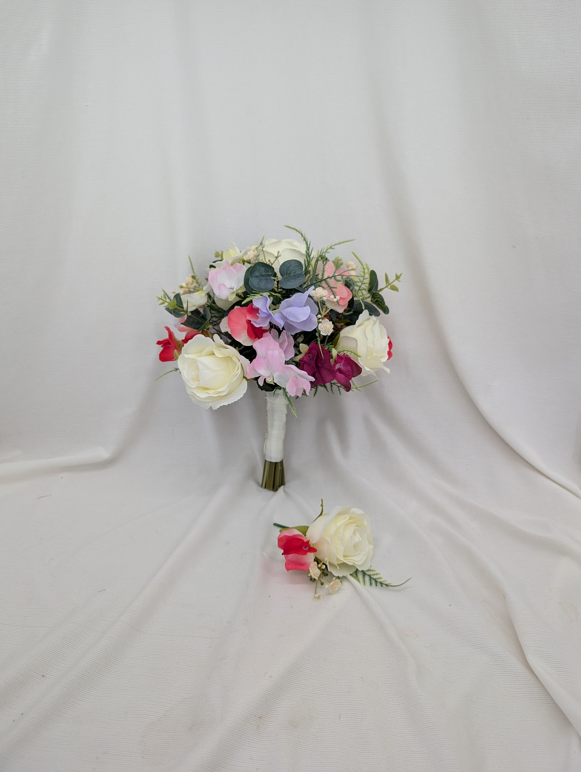 This beautiful Spring Summer wedding set features Sweet pea, Ivory Rose, Gypsophila, Eucalyptus and Plastic Asparagus Foliage. Each item is handmade in the UK by a fully Qualified Florist using the same techniques as fresh flowers, however the realistic artificial flowers used in these designs have the advantage of being an ever lasting keepsake from your wedding day.