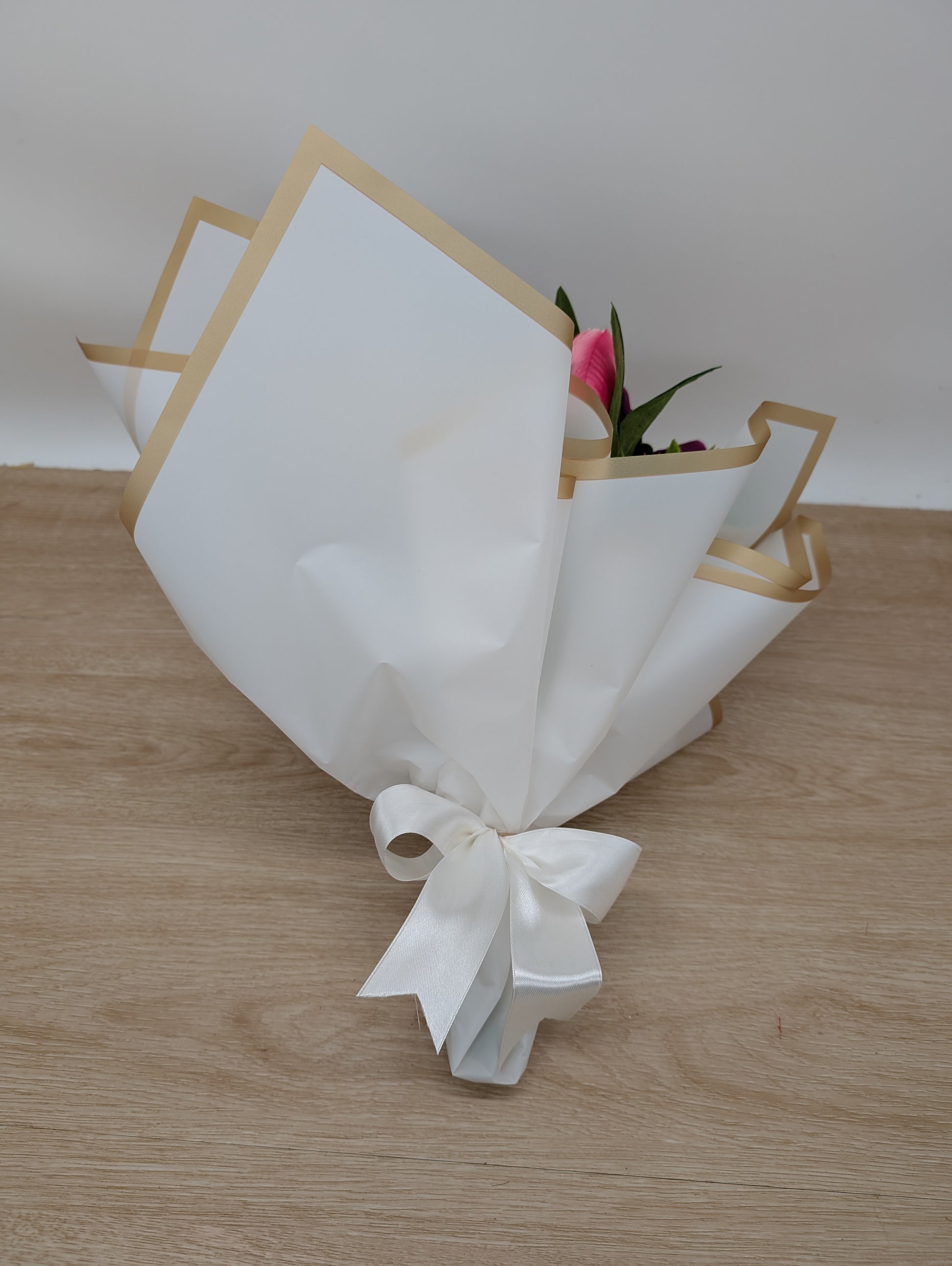 Celebrate and occasion with our stunning Tulip Gift Bouquets. Each arrangement features lifelike artificial tulips and complementary plastic tea leaf foliage, wrapped in ivory cellophane with gold accents, finished with an ivory satin bow. Perfect for Mother's Day, birthdays, or any special celebration, these bouquets can be used in your existing vases for an instant floral arrangement